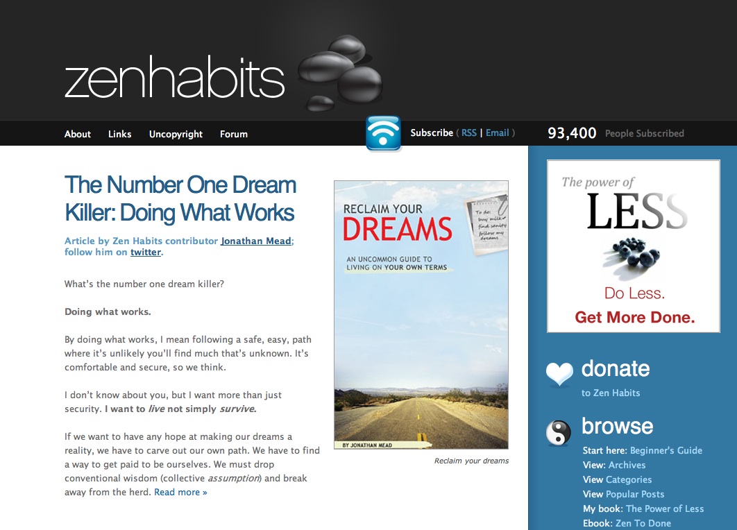 I’ve been reading Zen Habits for a while. I don’t agree with everything Leo writes, mostly because some of it isn’t practical for me. But I still find most of it valuable and useful.