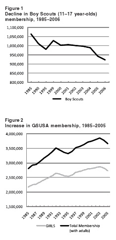 It was a very interesting, well-written paper. It was fascinating to see the differences in membership between the scouts. However, I think that other factors have to explain why the girl scouts have thrived and the boy scouts haven't. Some ideas: