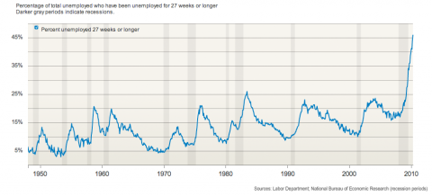Lots of people are buzzing about this chart from the Wall Street Journal, which looks at the historical percentage of the unemployed who've been without a job for 27 weeks or more. Hey, I'm one of those blips.