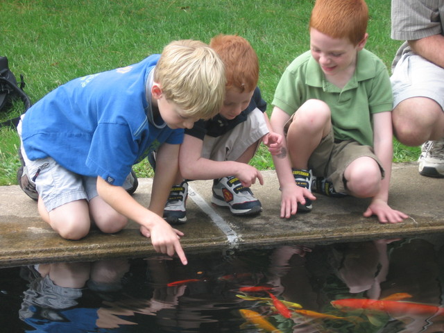 I took this picture with my first digital camera, which wasn't able to make very sharp images. Still, I like the picture, because the boys' hair mimics the colors of the fish. Lovely orange and gold.