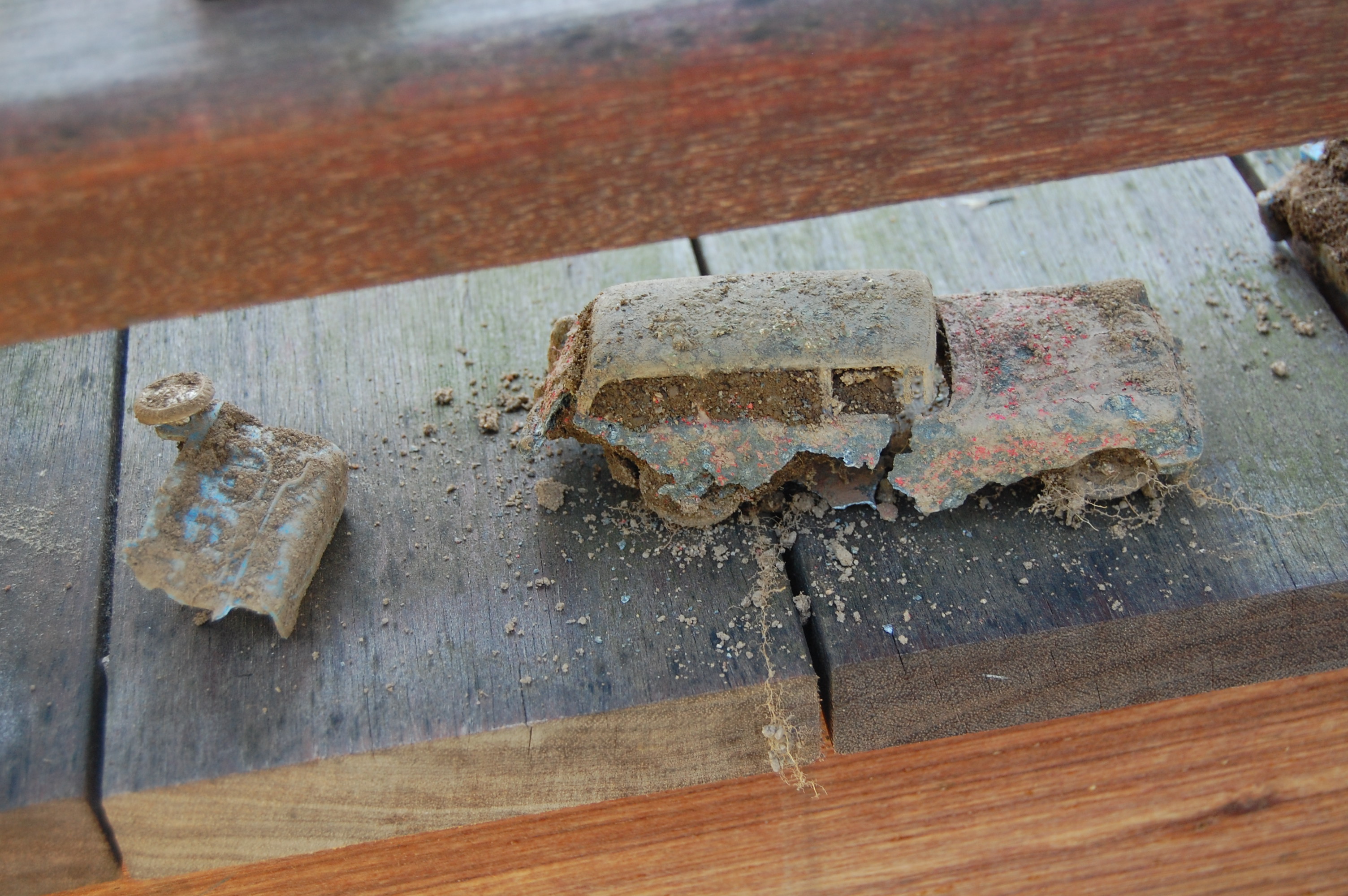 When we were digging, we found an old truck. Some kid must have buried it in the backyard about fifty years ago. Backyard archeology.