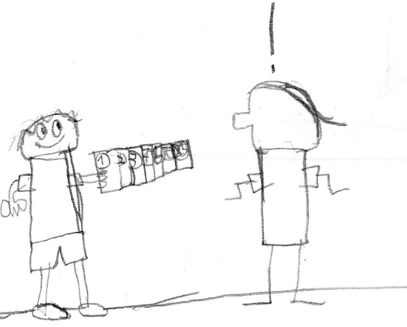 He drew a picture of himself explaining to Abby Klein that his teacher wanted him to read Books 1, 2, 3, 4, 5, and 15. Abby Klein is saying, "What the?"