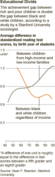 “We have moved from a society in the 1950s and 1960s, in which race was more consequential than family income, to one today in which family income appears more determinative of educational success than race,” said Sean F. Reardon, a Stanford University sociologist. Professor Reardon is the author of a study that found that the gap in standardized test scores between affluent and low-income students had grown by about 40 percent since the 1960s, and is now double the testing gap between blacks and whites.
