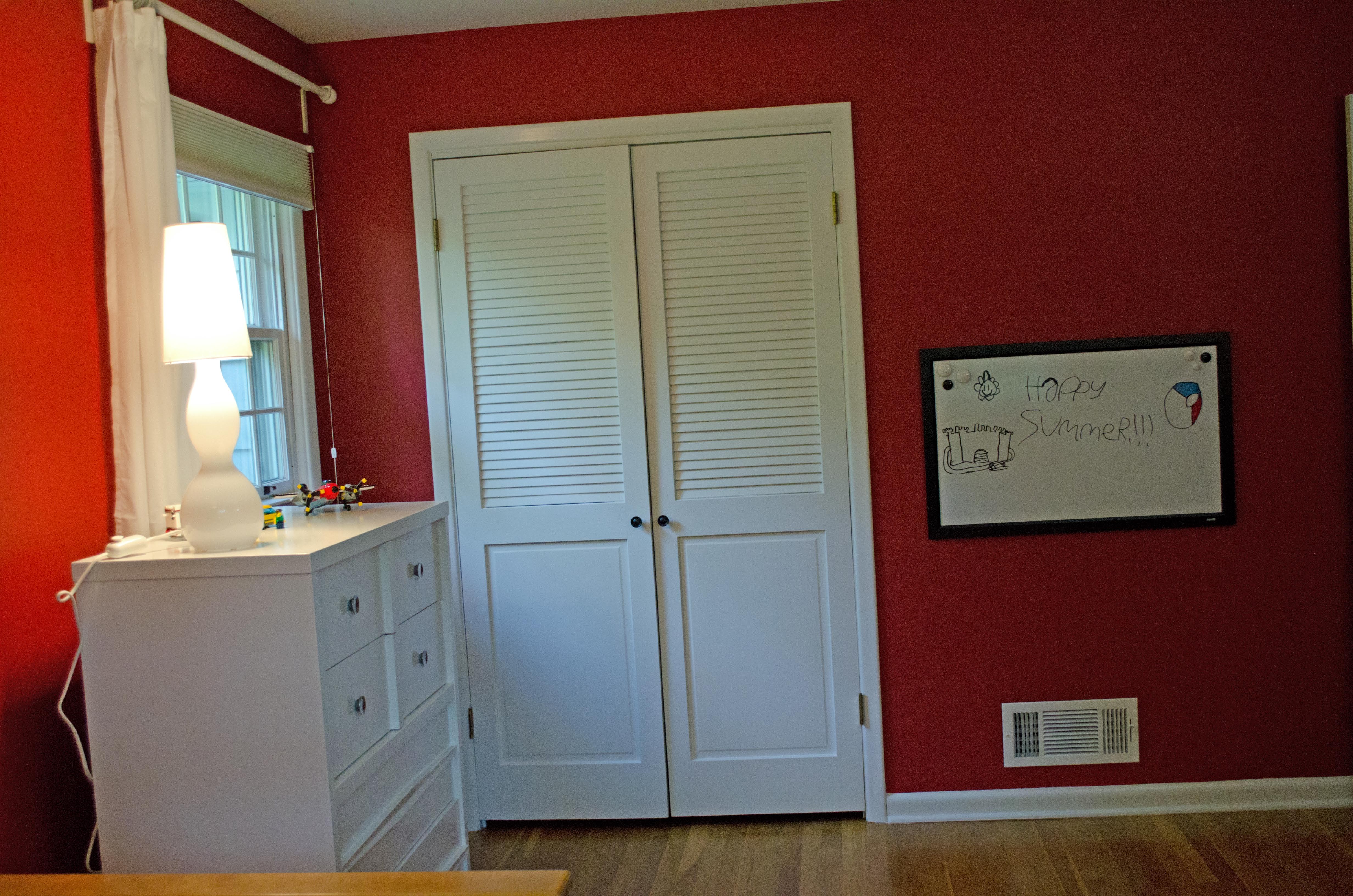 Here's the new room. Benjamin Moore Moroccan Red. Ian's room doesn't have the white built-ins like Jonah's room, so we had to buy more white accessories. Like a white board, which was positioned low enough to be an easel. It was from Target.