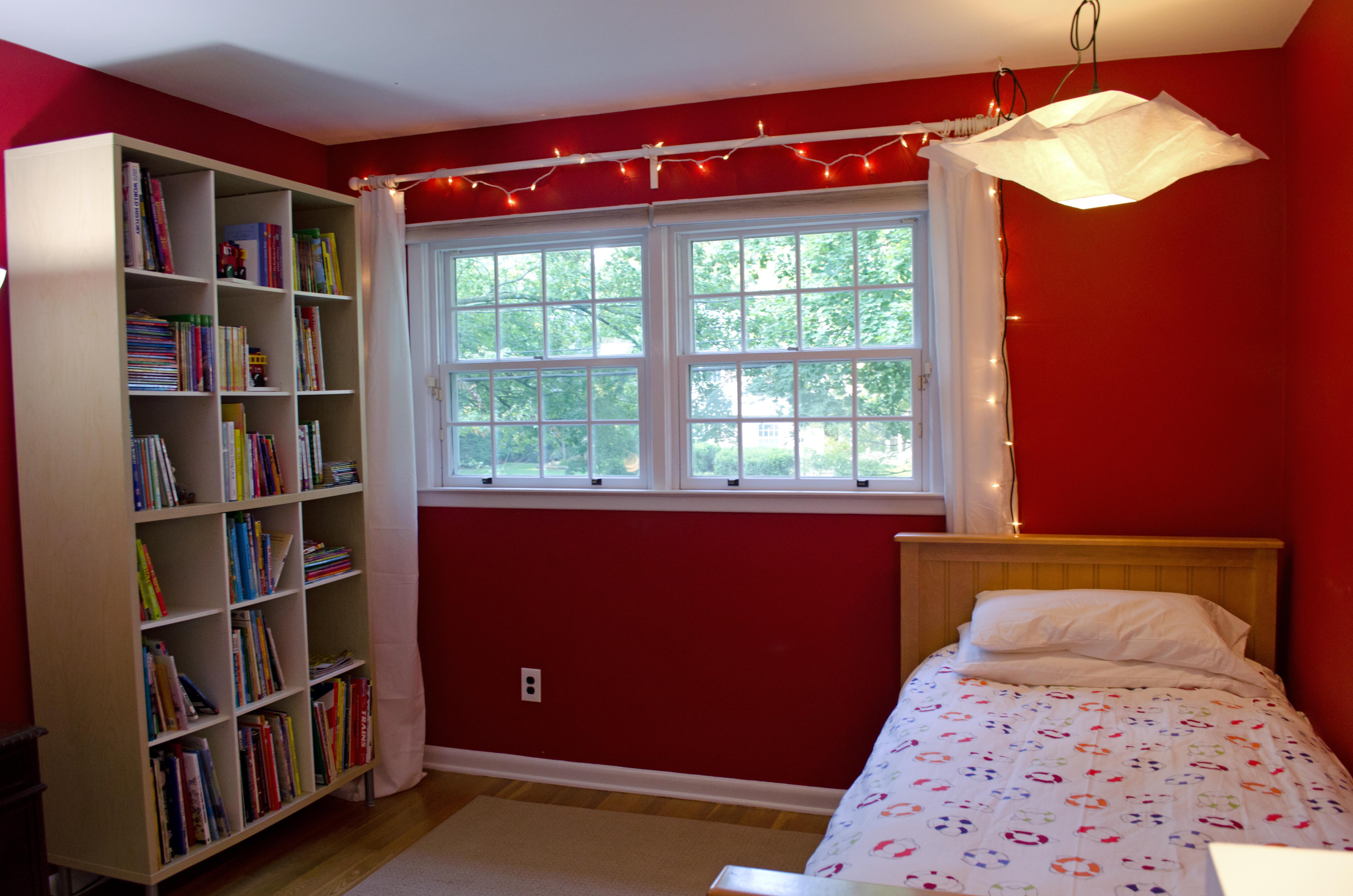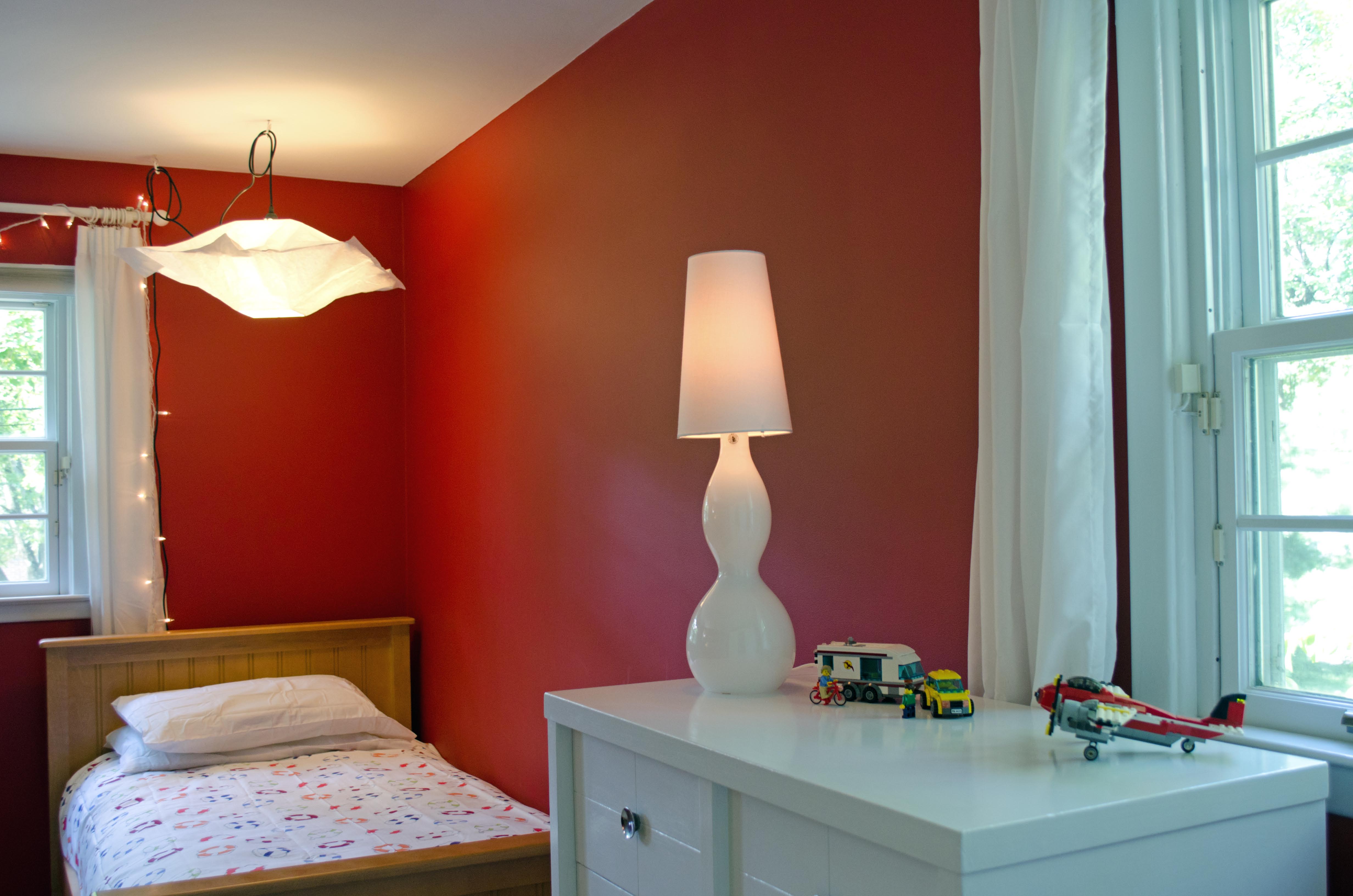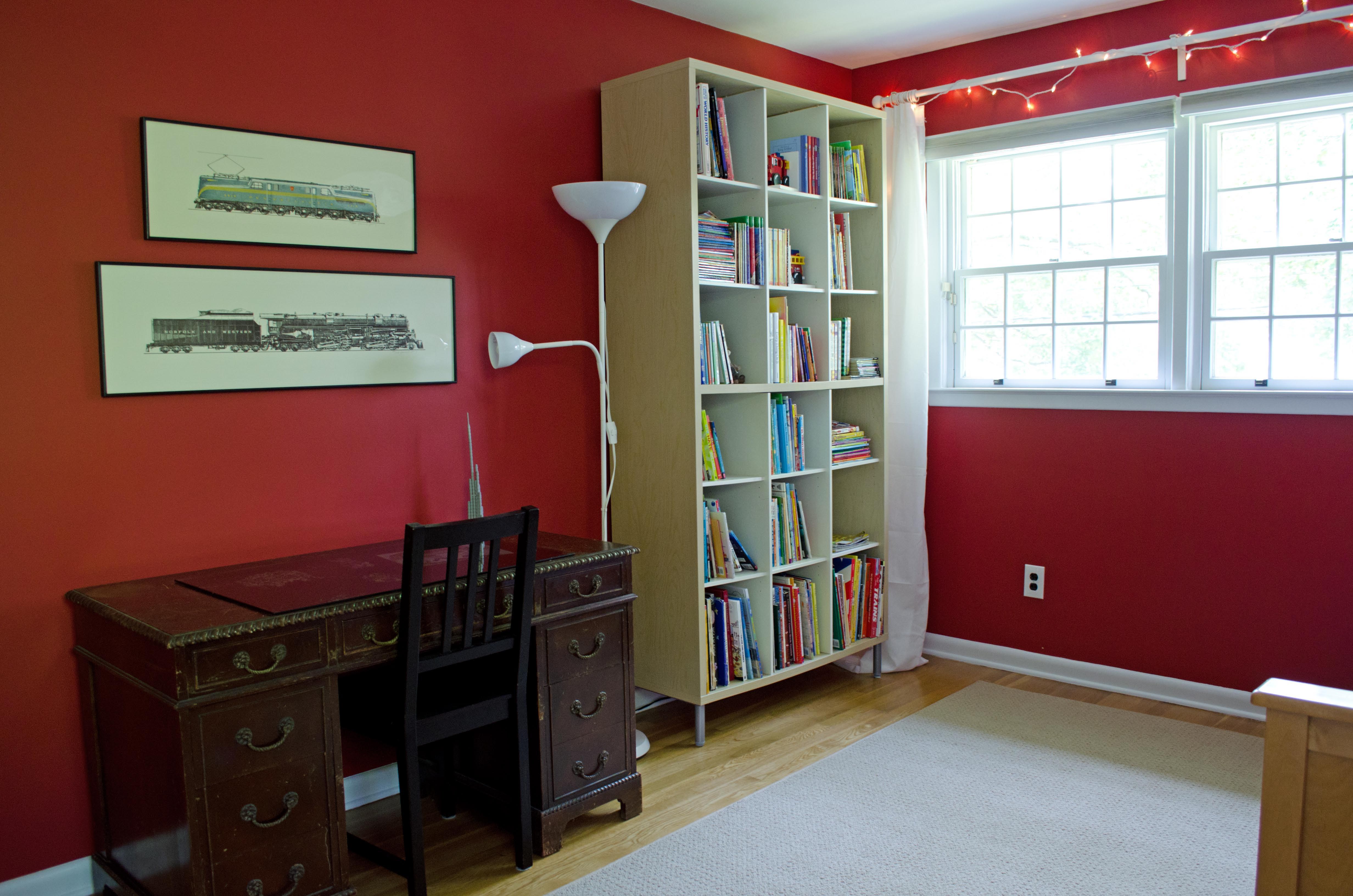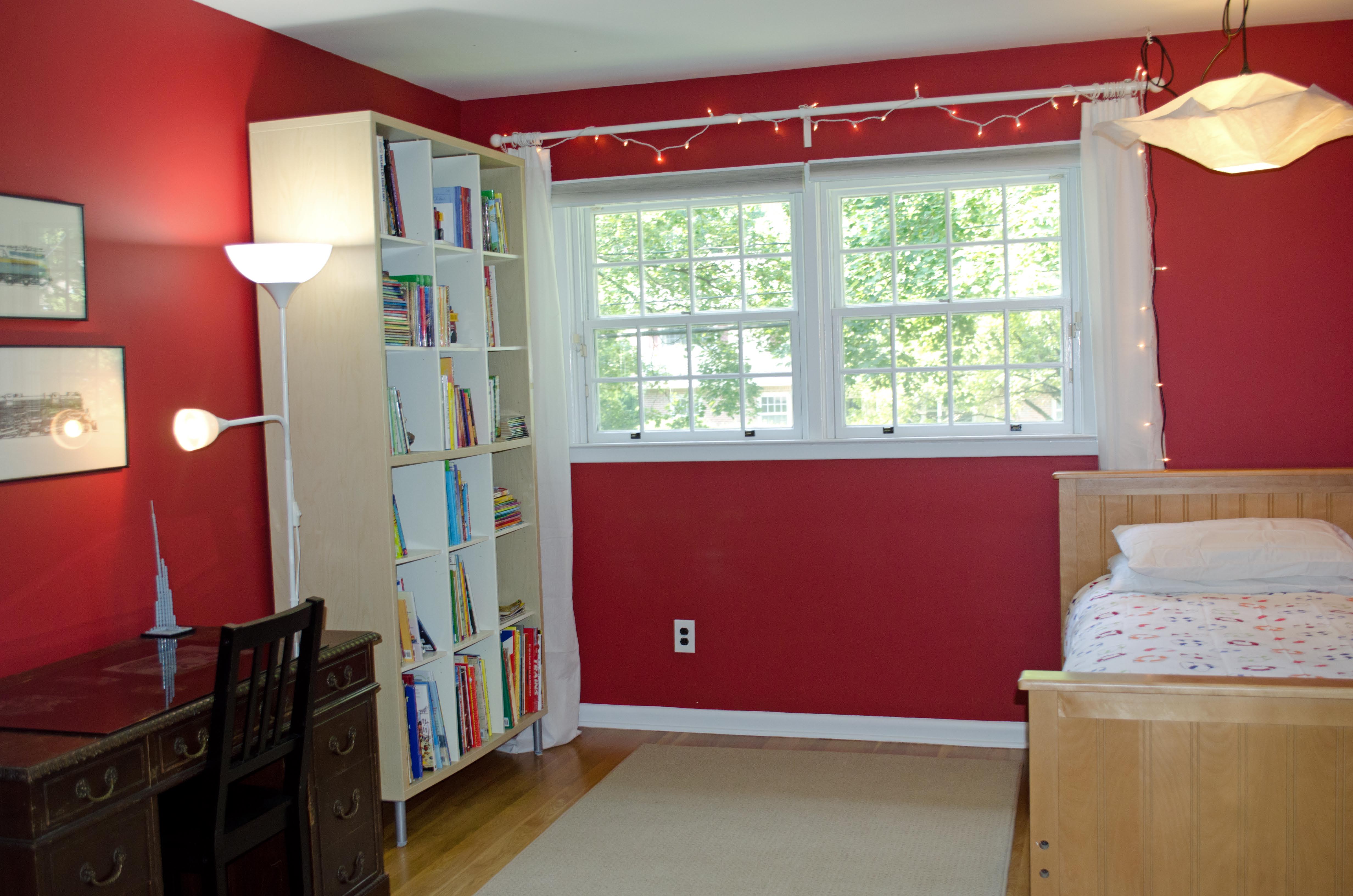 The boys love it. Ian’s color is very dark and I was first afraid of it, but now I really like it. I tried to convince him to do an accent wall, but he wanted all four walls dark red, so that’s what he got. And it’s fine. It’s very cozy and rich. A very sophisticated take on the traditional boys’ red.