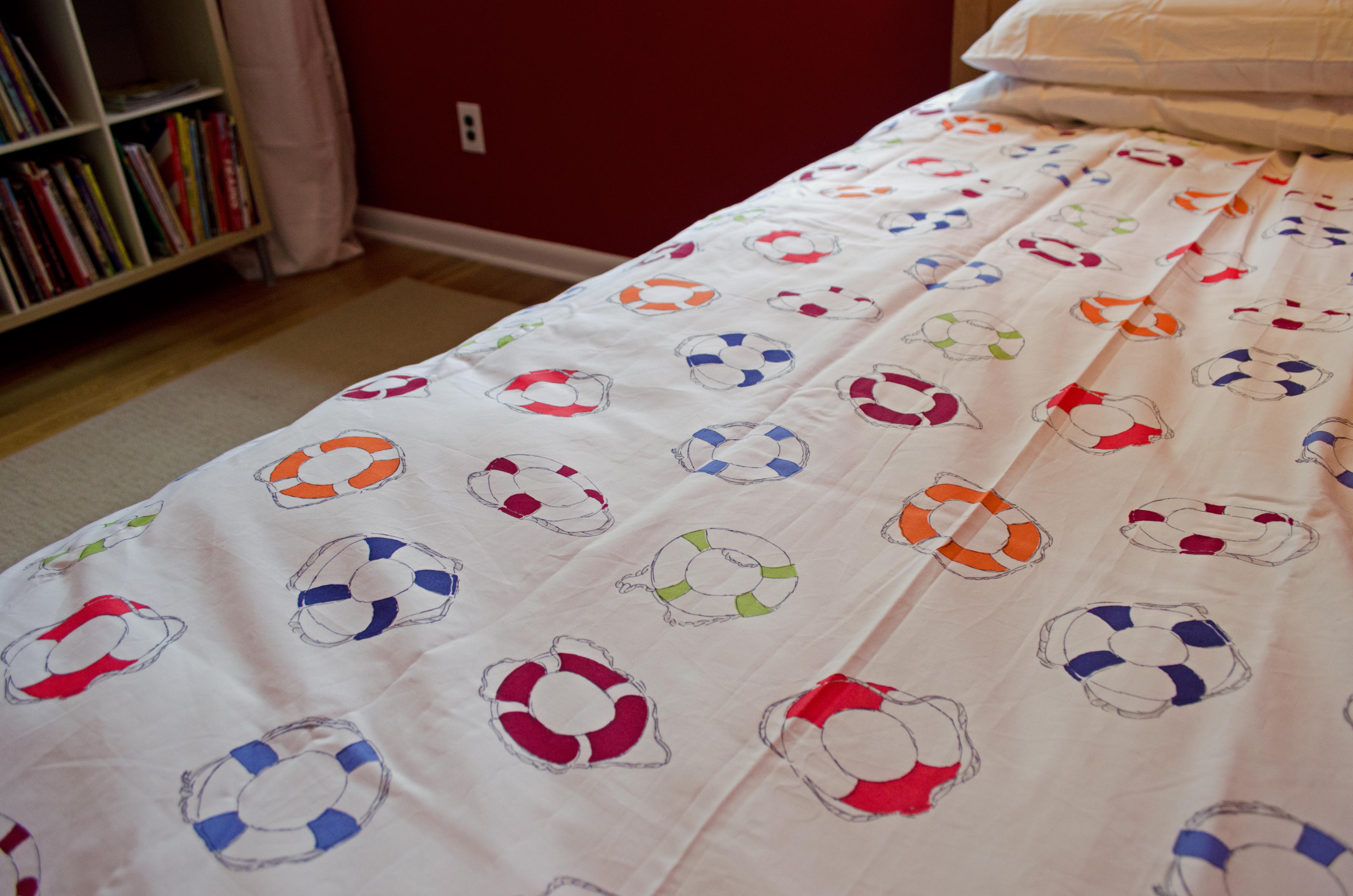 The duvet cover is new. It's from Garnet Hill. I like getting duvet covers from fancy places and then using sheets from Target. Because it is better to look good, than to feel good. Jonah has the same one. I like that the life preservers are blueberry and maroon. I bought this from their clearance catalog. $44.
