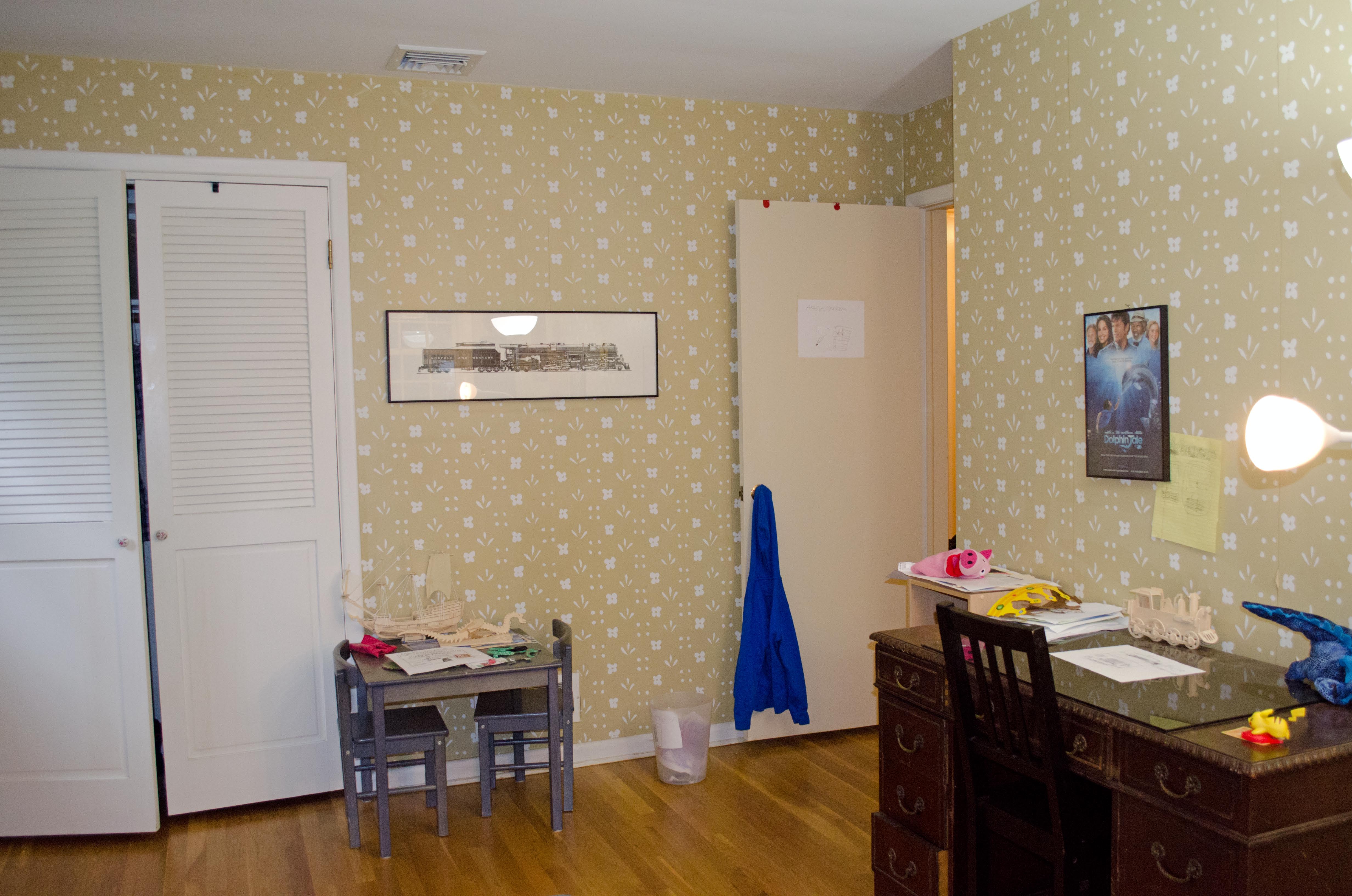 I think this wallpaper was original to house. Circa 1959. It's not a horrible pattern, but it just isn't appropriate for a boy's room.