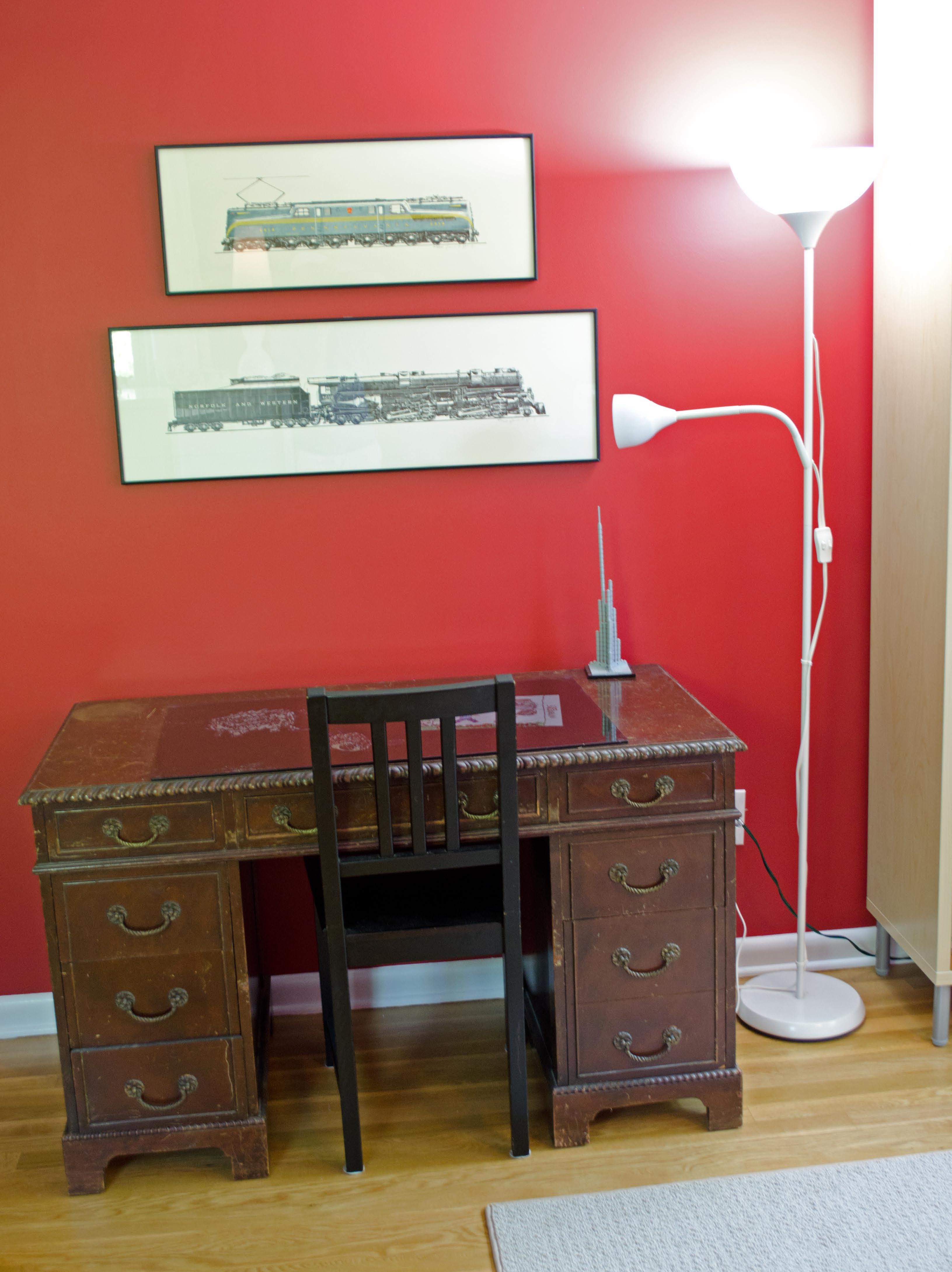 We have an unofficial formula for decorating – 1/3 investment pieces, 1/3 IKEA, and 1/3 knackered old thing. Those framed train prints are investment pieces. We bought them for $25 at a train museum in Virginia. They're signed and numbered by the artist. They remind us of a stage of our lives when the boys were obsessed with trains and we visited every train museum in seven contiguous states. The frames were very expensive, but they are lovely prints and they have great memories associated with them. The lamp cost $7 from IKEA. The desk is a beat-up hand me down from Steve's folks. The glass blotter comes from IKEA, too.