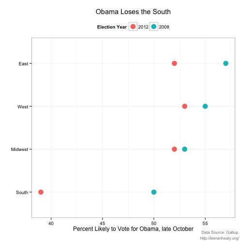 2. I think this graph will be interesting to look at after the election, though I still think that there’s too much diversity in each of those regions to make meaningful sense of the averages. The graph I liked, and haven’t found again (need to look) was a graph that showed the trends in each state (which is still pretty diverse, but not as bad as region maps). The graph looked like waves showing the proportion of vote in each state in each election (through the 50’s?).