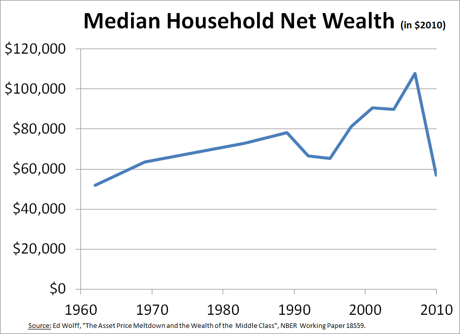 In a study for NBER, Edward N. Wolff found that median wealth plummeted over the years 2007 to 2010, and by 2010 was at its lowest level since 1969.
