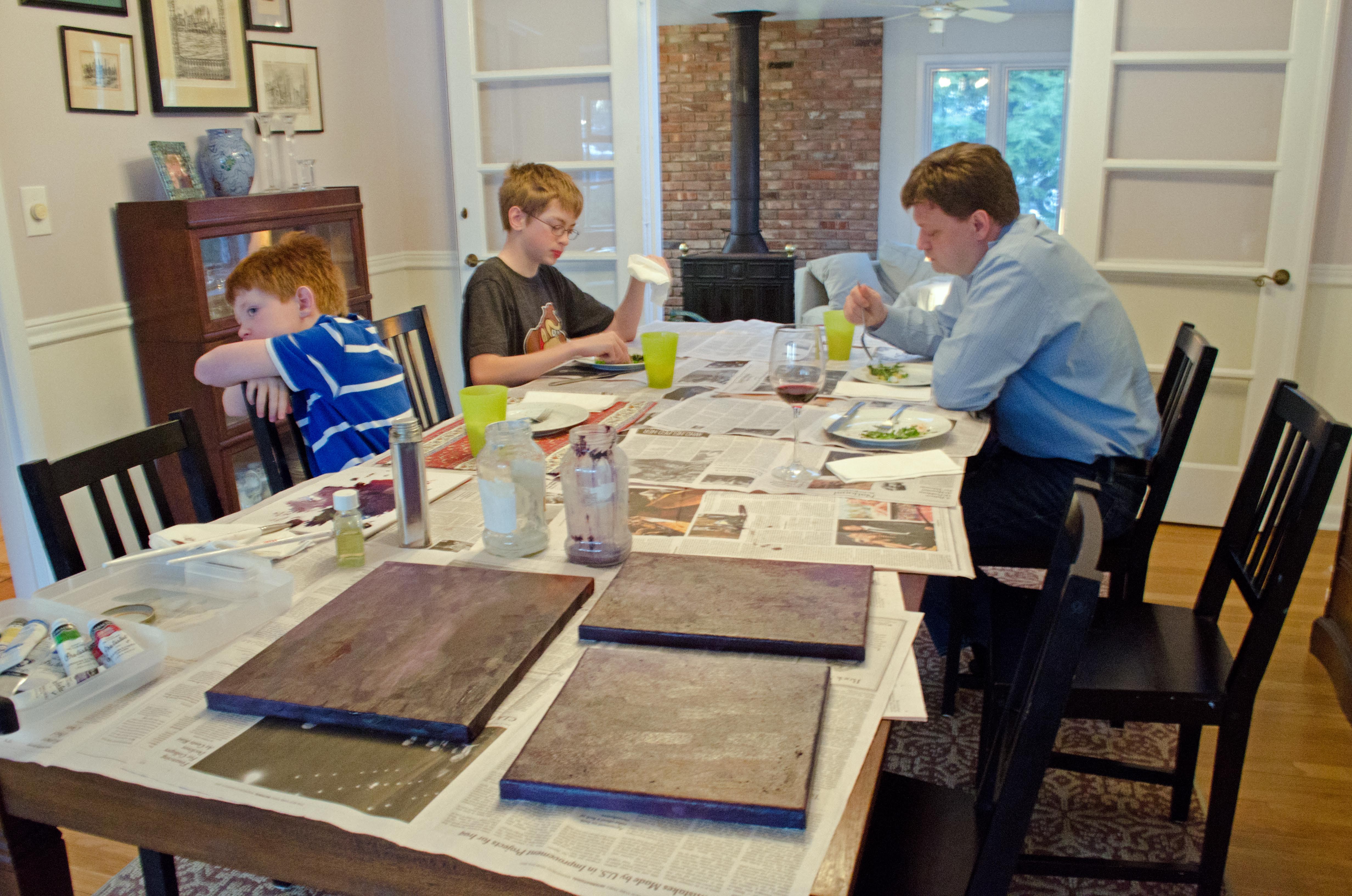 I've been playing around with my old oil paint supplies and making some DIY abstract paintings. It takes a couple of days to get it right, so we had to eat dinner in the midst of my mess this week. Ian was a bit annoyed and insisted on putting a placemat over the newsprint. The rest of us liked it, because we could read while eating dinner.