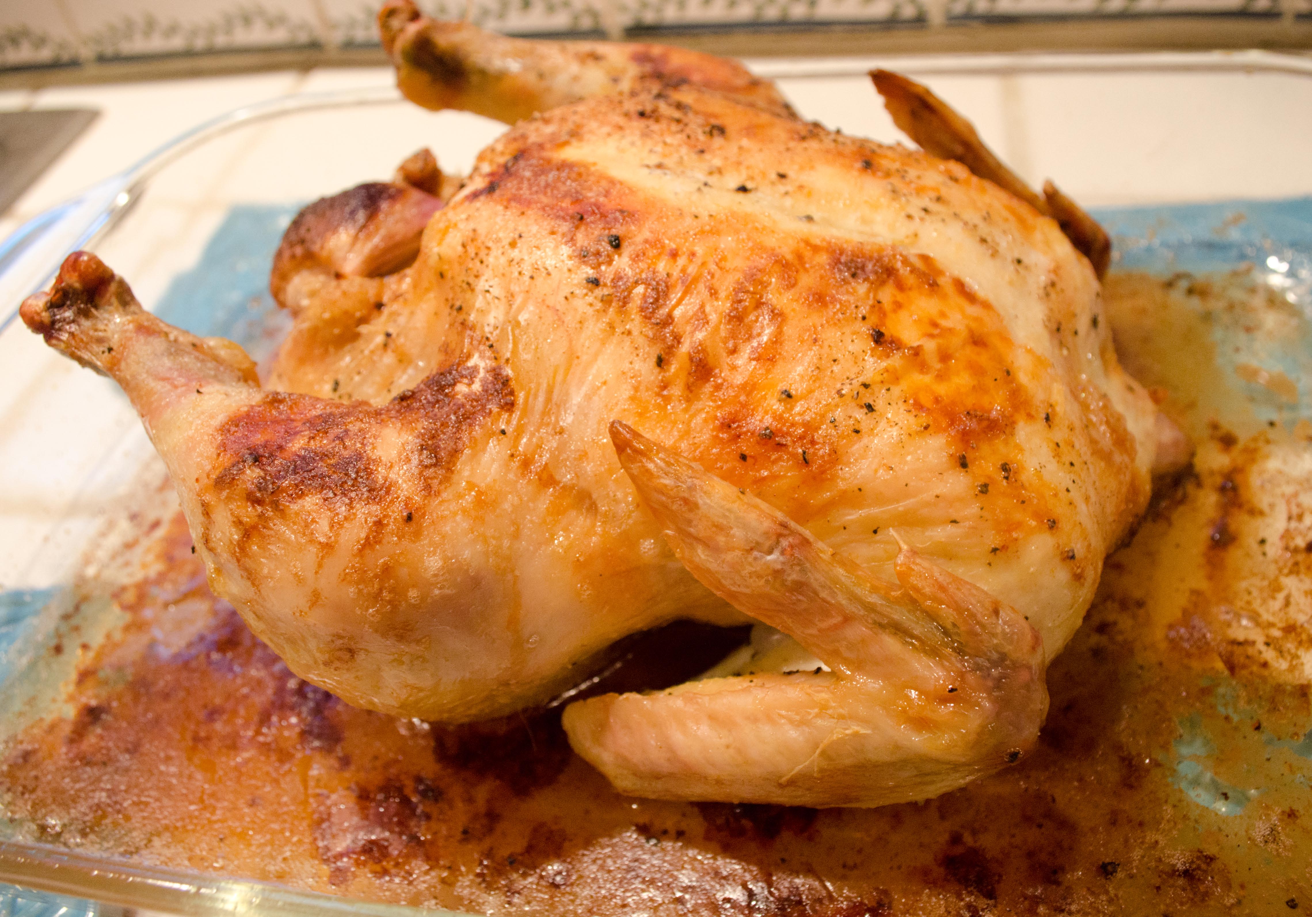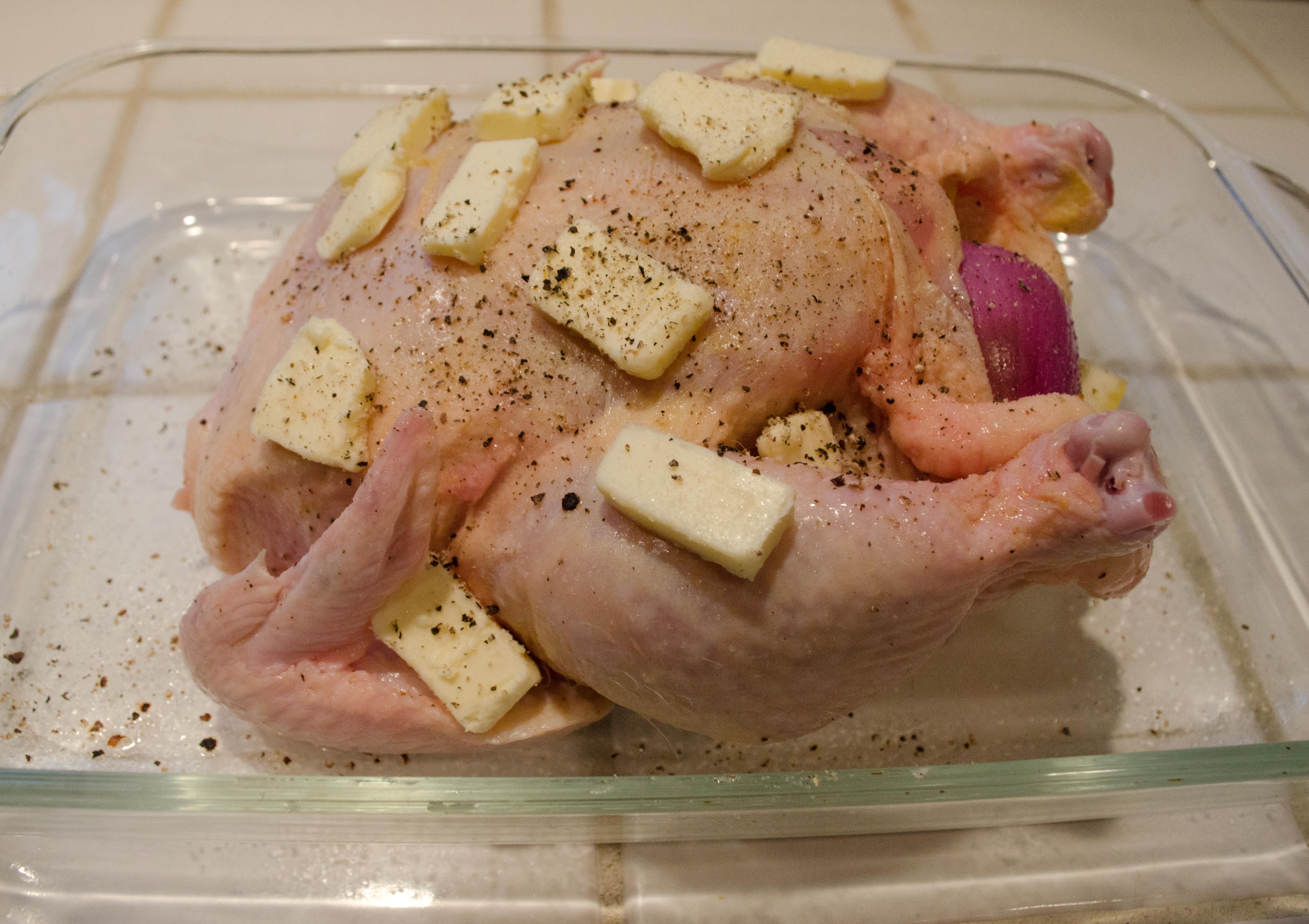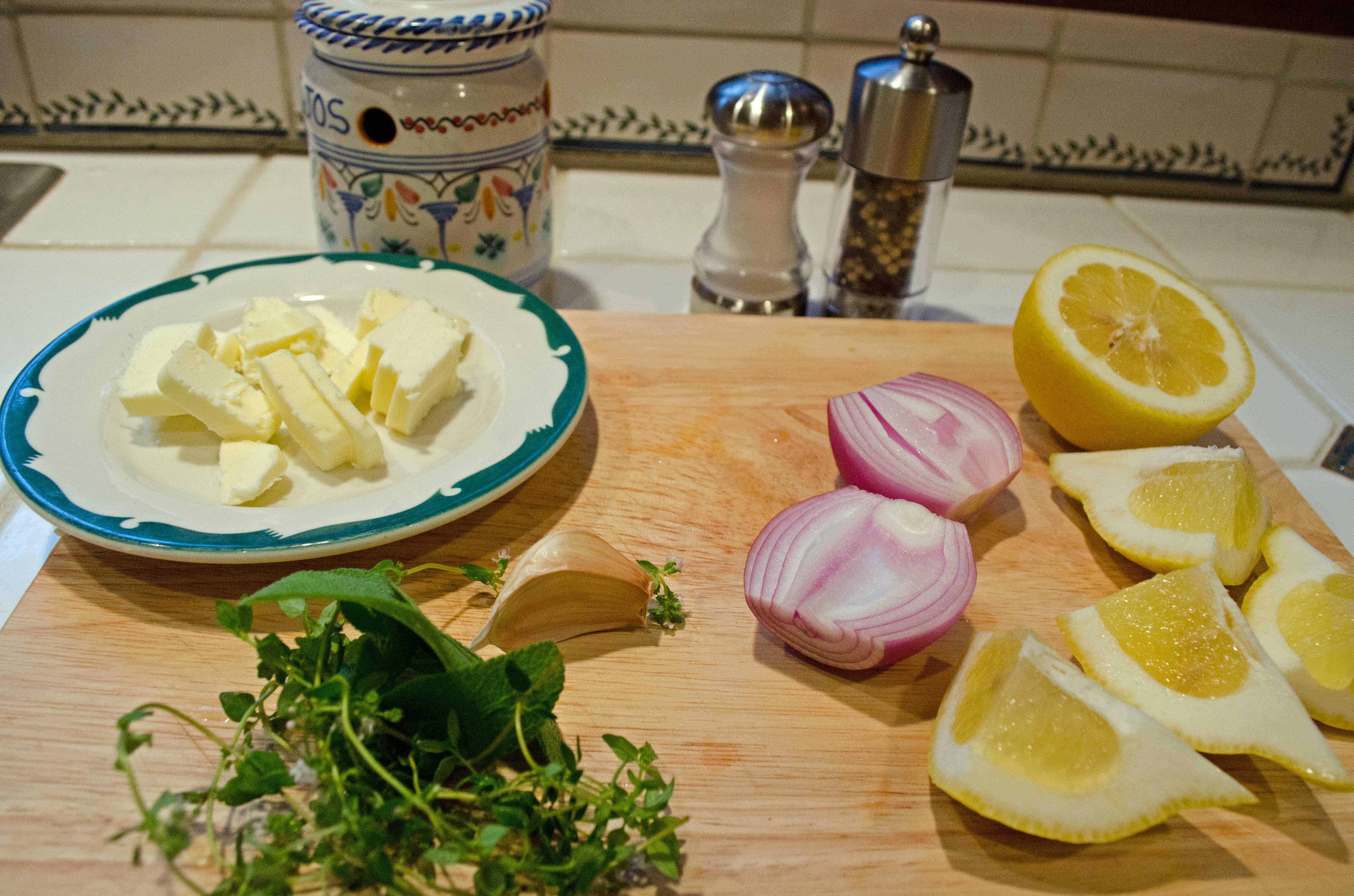 I throw in a few basic ingredients inside the chicken – half a lemon, an onion, salt, pepper, a whole clove of garlic, and sage and thyme from the garden. On the outside, there’s just butter and salt and pepper.