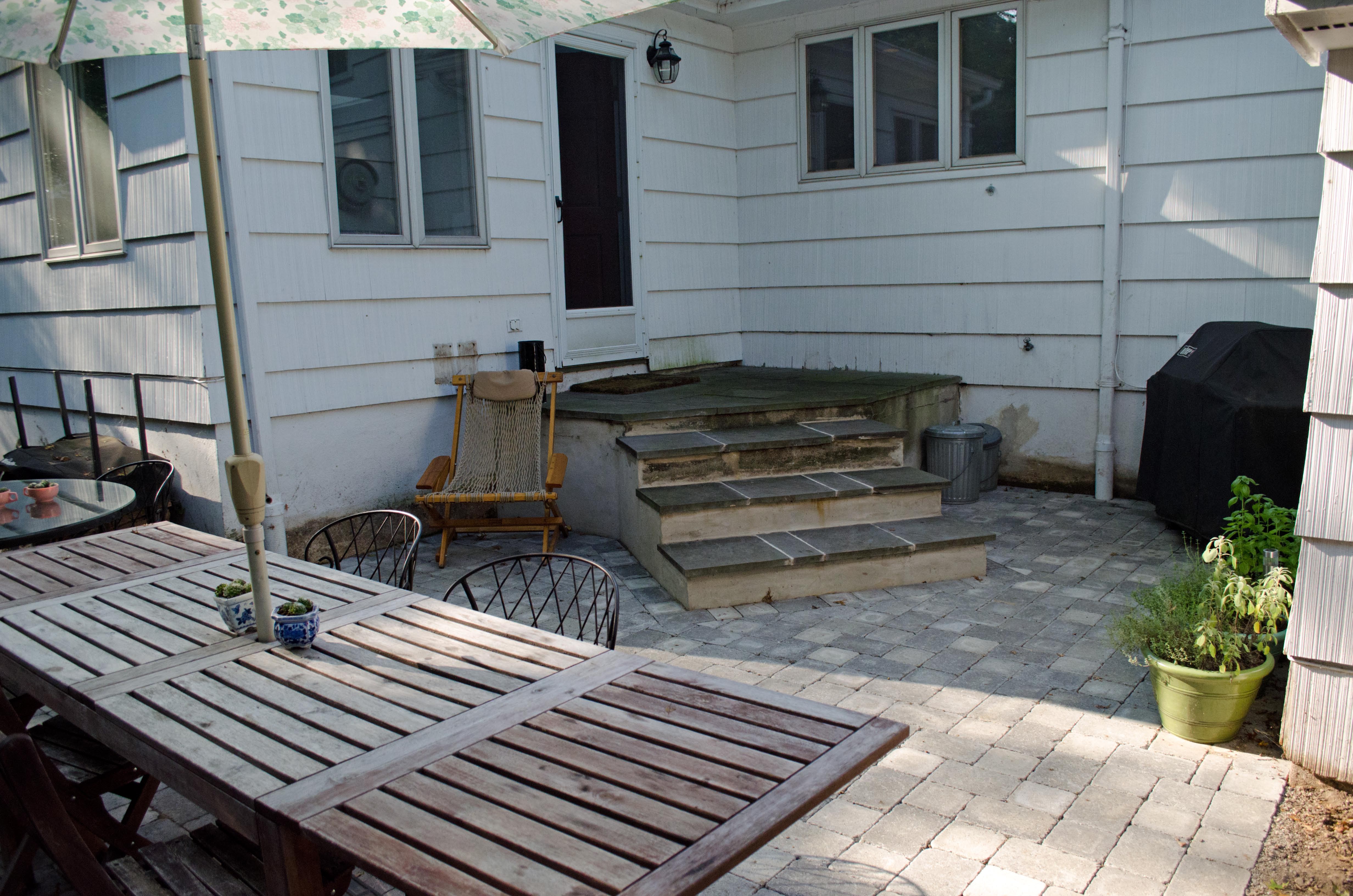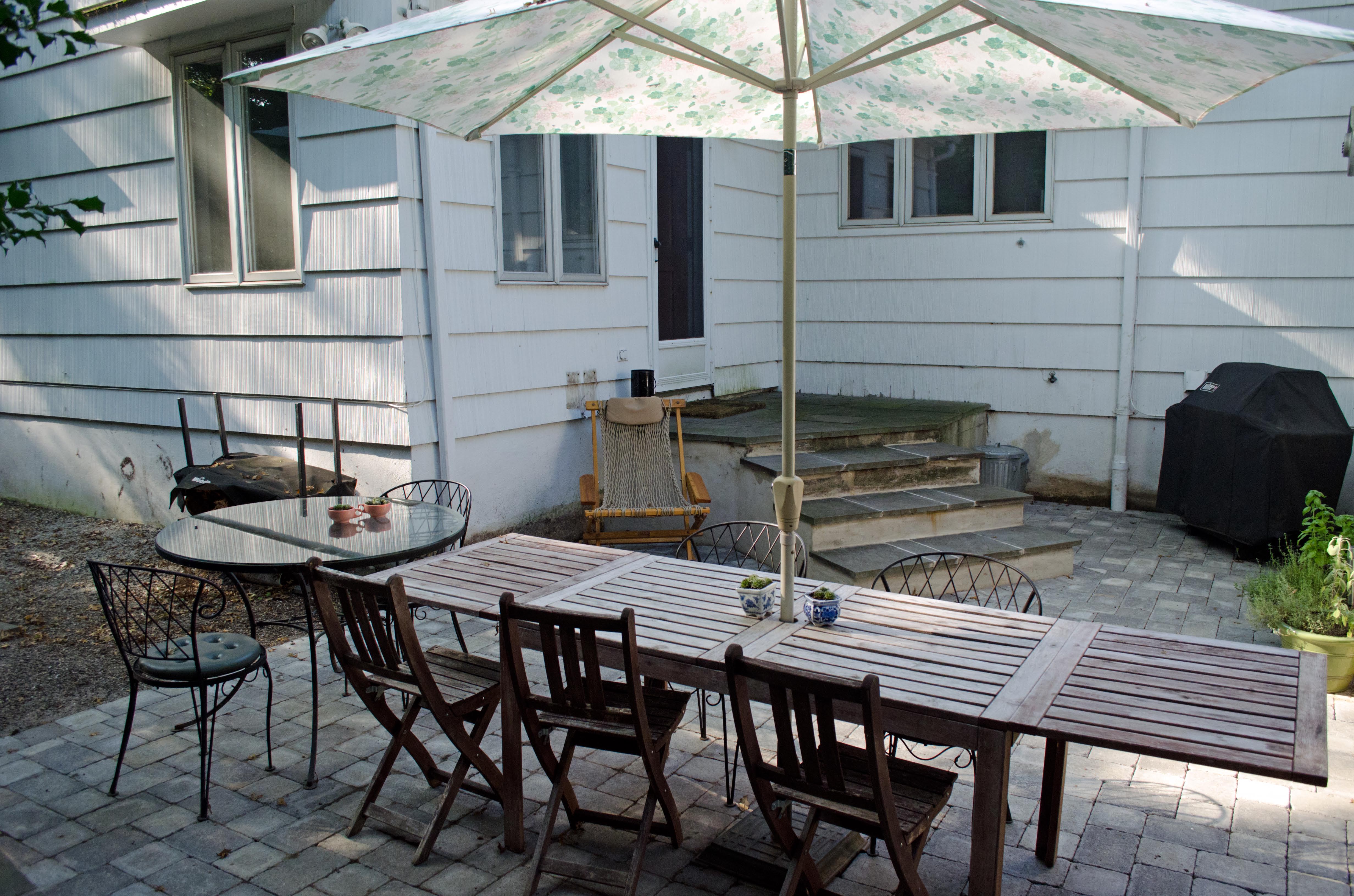 We put in a new back patio not only to have an outside dining area. We needed to remove the awkward cement steps that were funneling water into a corner of the house and to straighten out the dirt line, which was hitting the wooden shingles and creating more water problems. So, we put in a lovely new patio, but now the dirty, half rotten shingles are exposed. The whole area needs a coat of paint. You can see the old dirt line on the foundation.