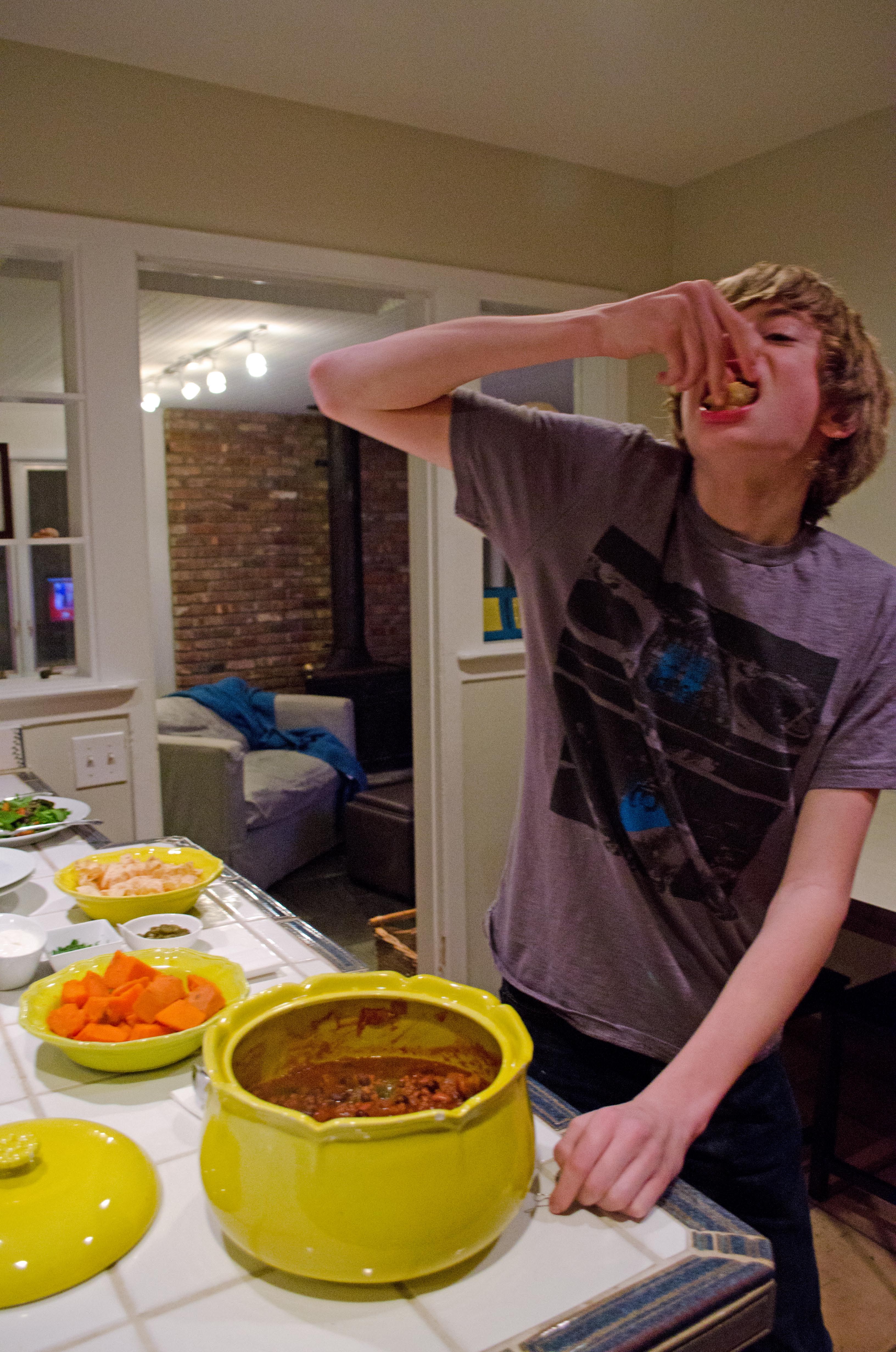 Teenage boys. They sulk. They won’t let you hug them. They stink. And they eat SERIOUS quantities of food. Here’s last night dinner. It’s for three people, because Ian doesn’t like chili, so I heated up something else for him.