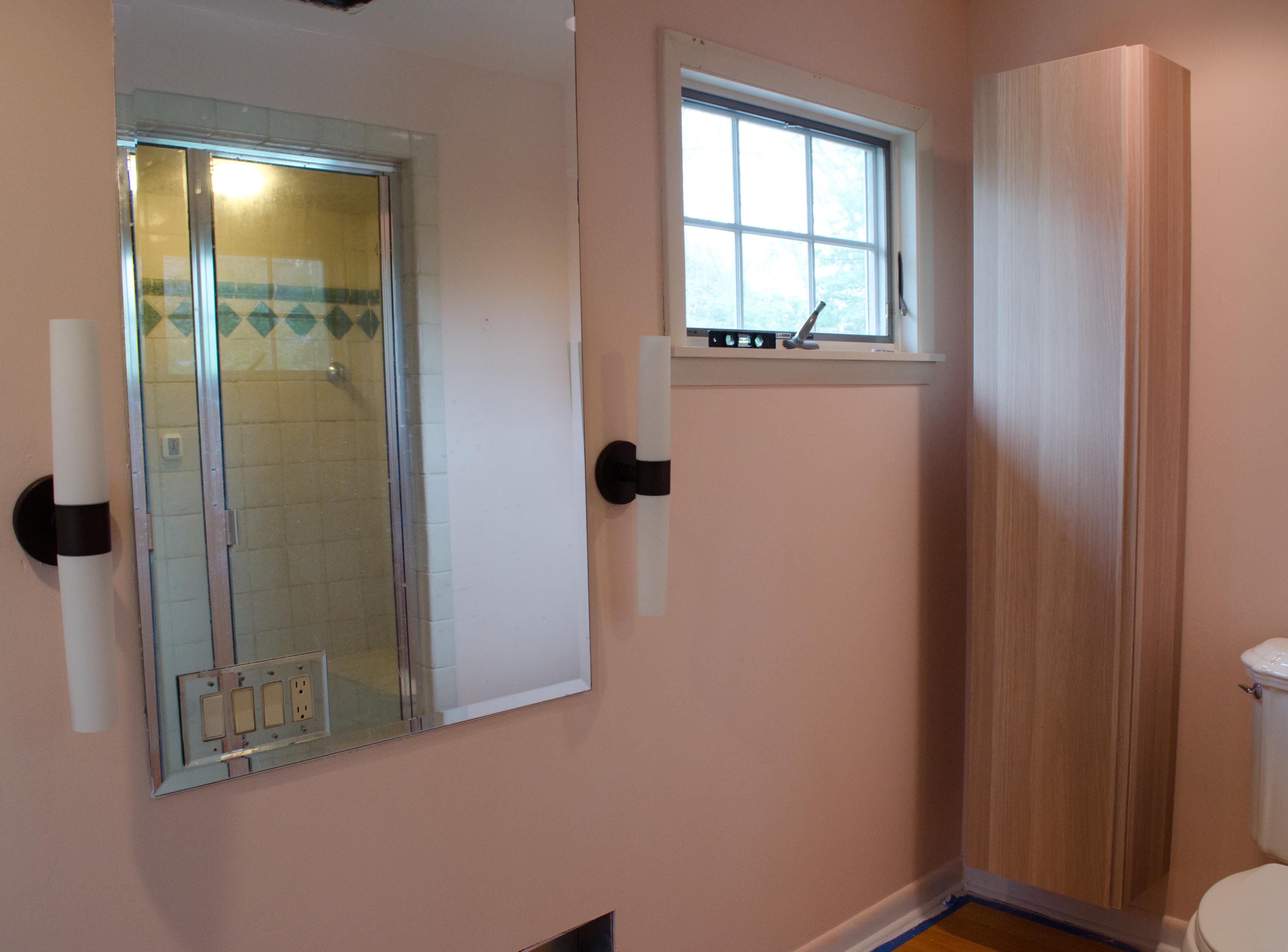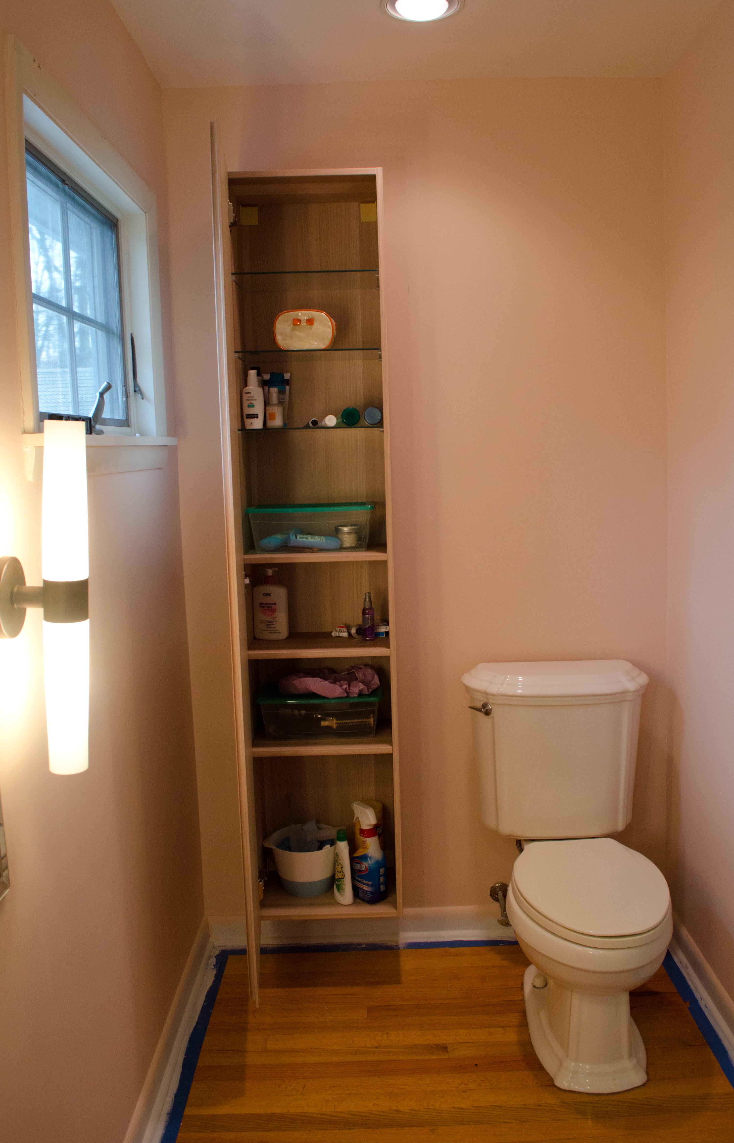 We slapped on a second coat of peach paint and mounted a cabinet on the wall.