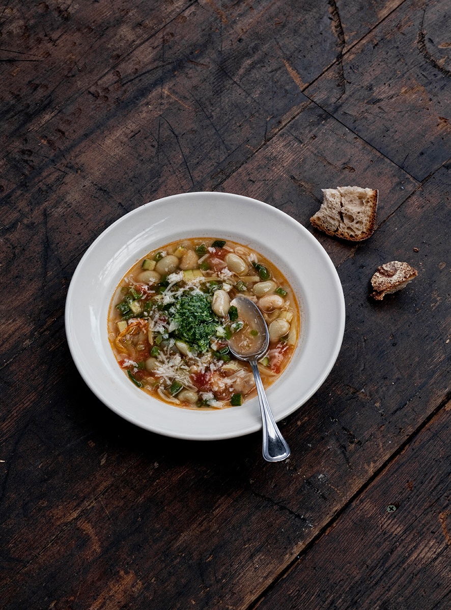 This is Alice Water’s summer vegetable soup with pesto. It looked so good that I found another article about the book, which has the recipe.