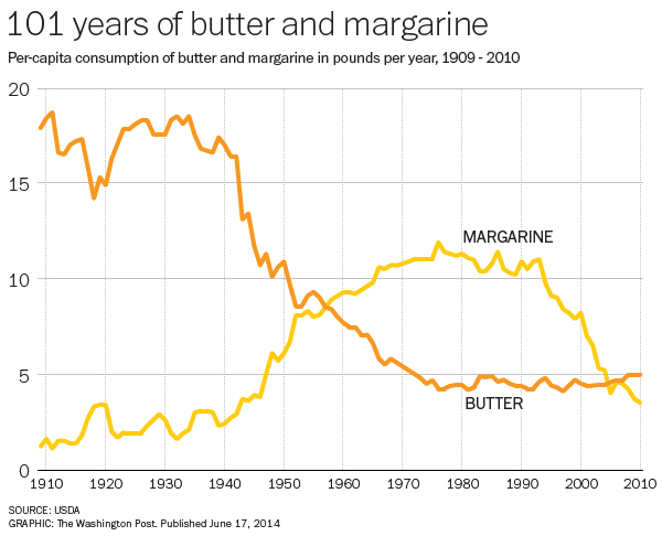 1. I don’t think butter is back in vogue, consumption is flat over the last 40 years with only the slightest increase. Margarine, however, collapsed, and is now back to 1945 levels. On a personal note, we use butter, and rarely, if ever, buy margarine. If you’re going to have fat, might as well have real fat.