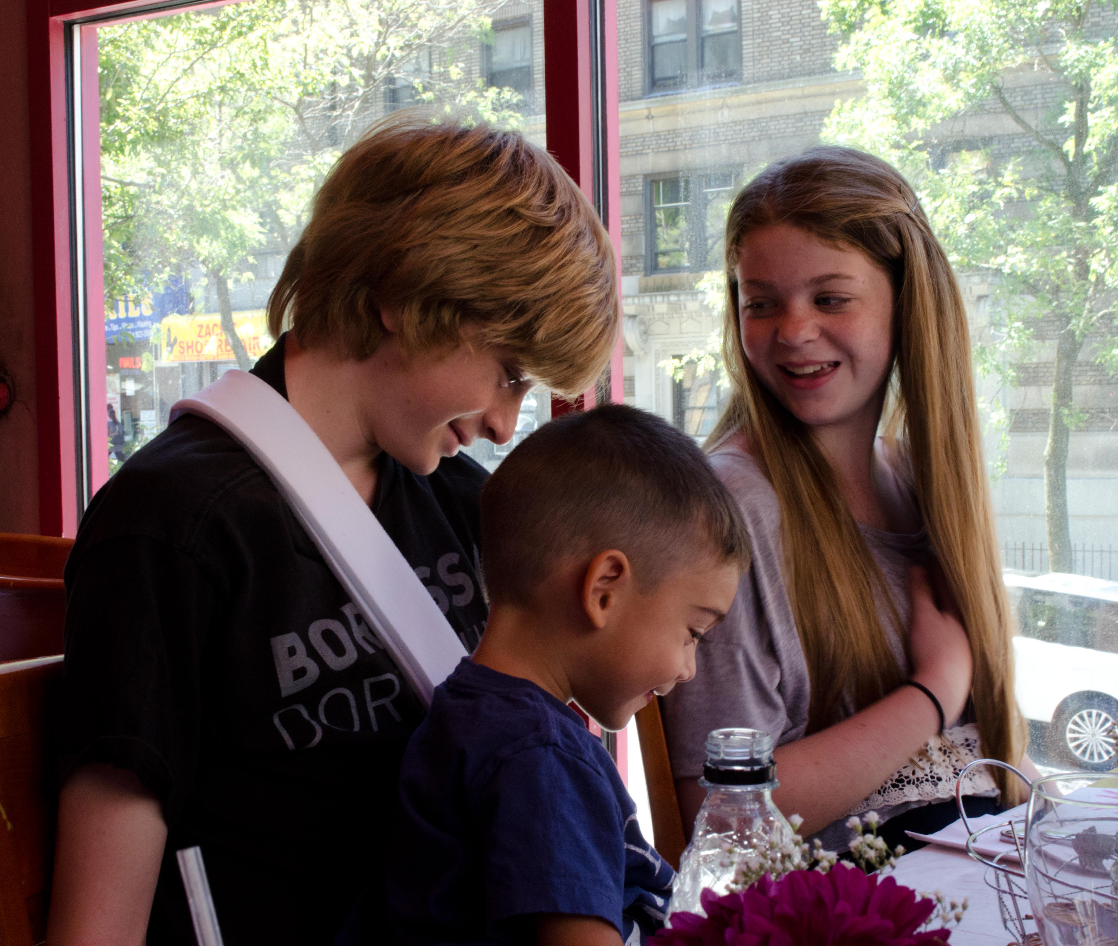 My cousin, Jay, was up from Florida last week. Sixteen of us jammed into a little restaurant in New York for brunch. Jonah and my niece are snuggling my Godson, Alex. He is an extremely snuggle-able boy.