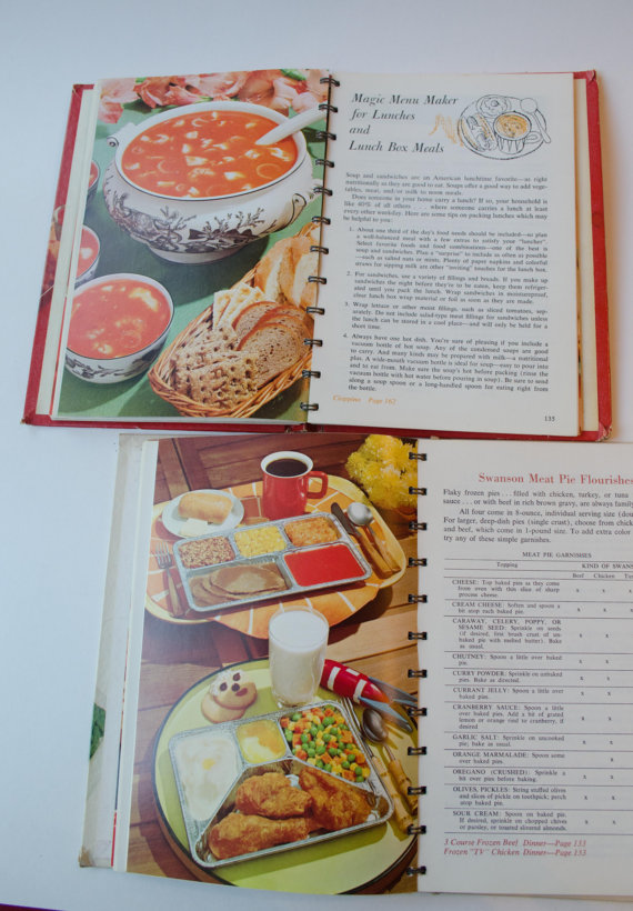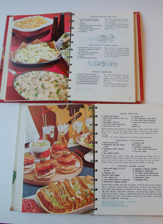 I have a terrible sore throat today, so I’m amusing myself by uploading the stacks of used books to my Etsy shop. My favorite of the day has to be two 1969 cookbooks written by Campbell Soup. Check out the questionable food choices in the 1960s.