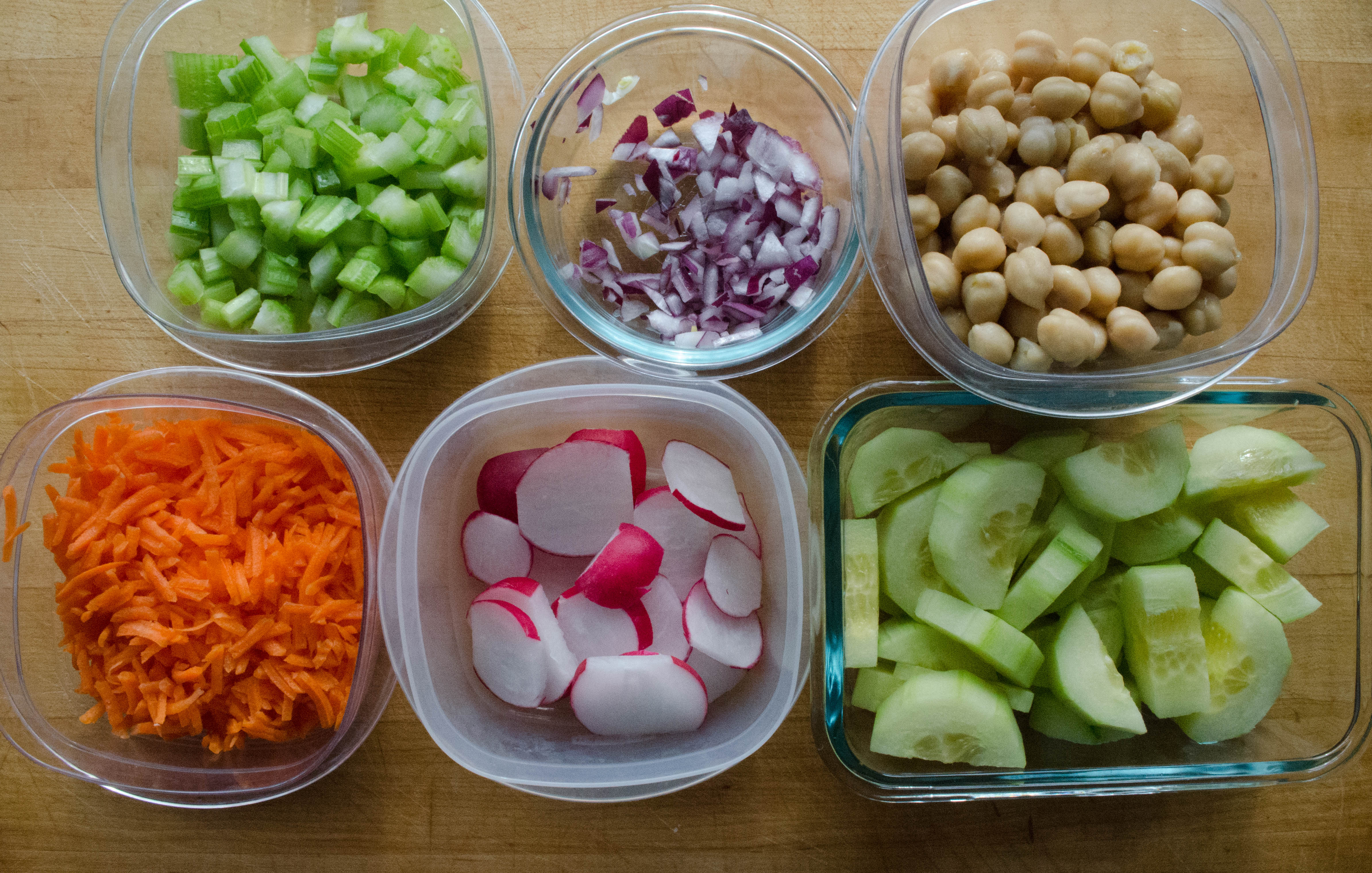 Other items that could be ready and handy might be — sliced hard boiled eggs, leftover chicken (also sliced and ready to go), rinsed beans of any kind, celery, shredded carrots, boiled potatoes, green peppers.