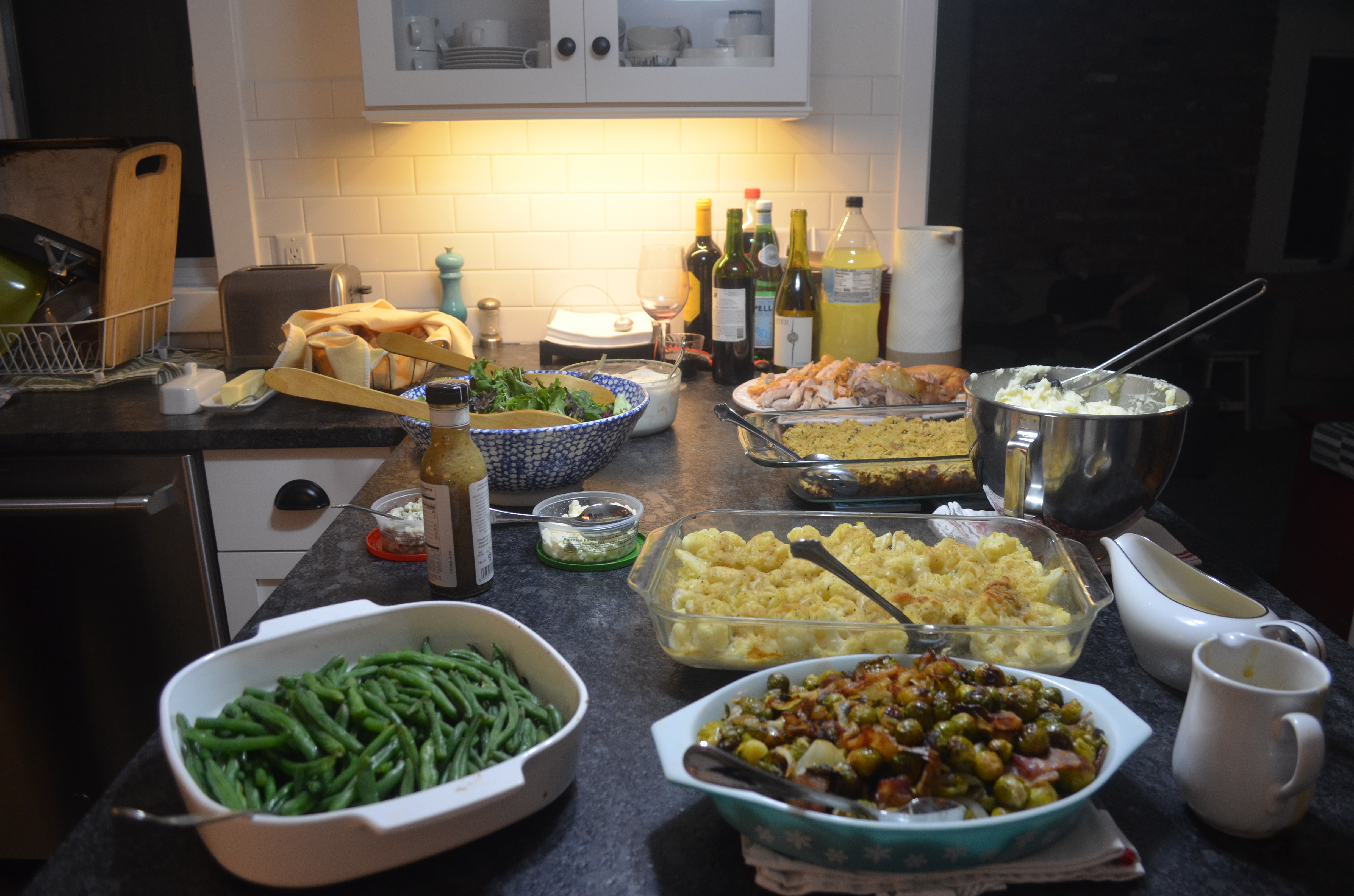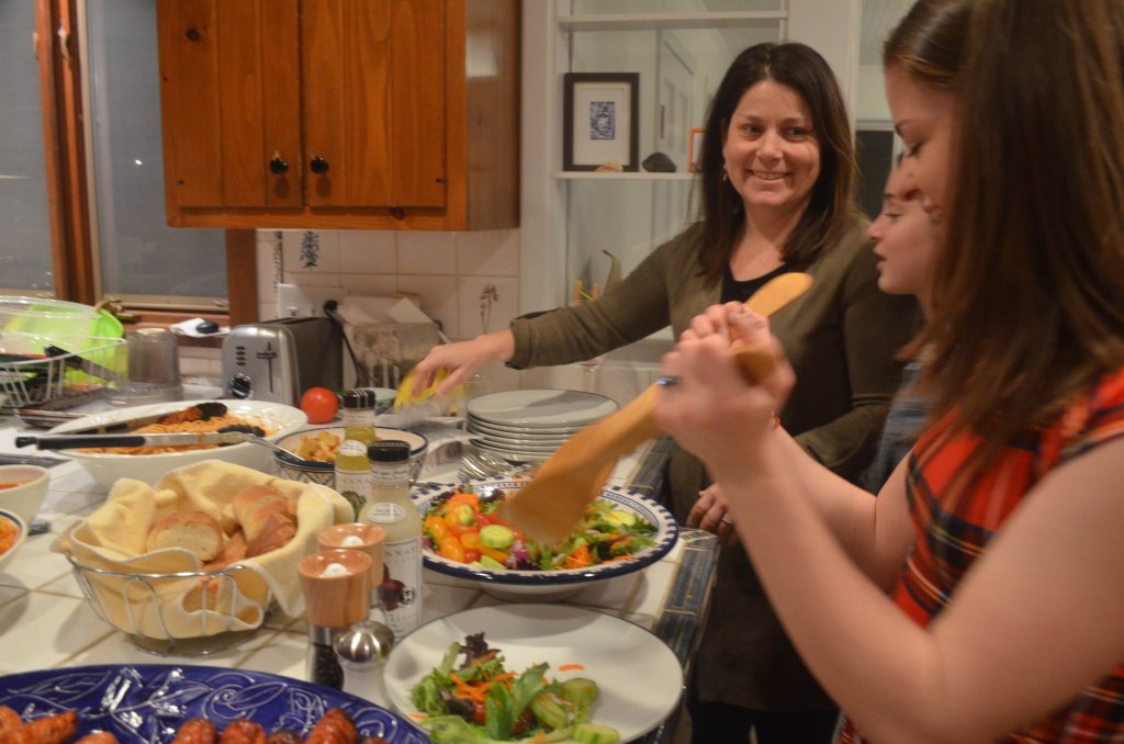 Another important, but often skipped step to cooking dinner is to transfer the food from the pots on the stove into serving bowls on the table. I know a lot of busy parents skip this step and just serve the food out of the pots on the stove, but that simple transfer of food from pot to bowl is essential. It keeps the food from over cooking. It makes everything look more appetizing. Somehow that two second step turns dinner time into an event.