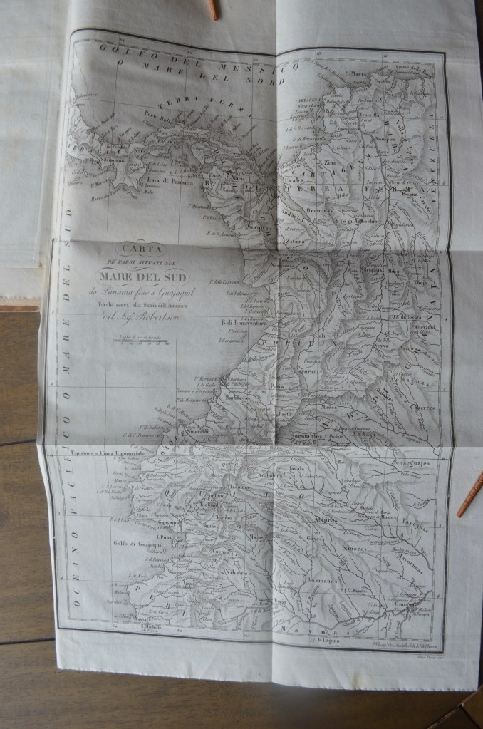 These three volumes of “History of America” by 18th Century Scottish historian William Robertson, translated into Italian. Vellum books, published in 1821-22 in Milan. There are four pull out maps in these three books.