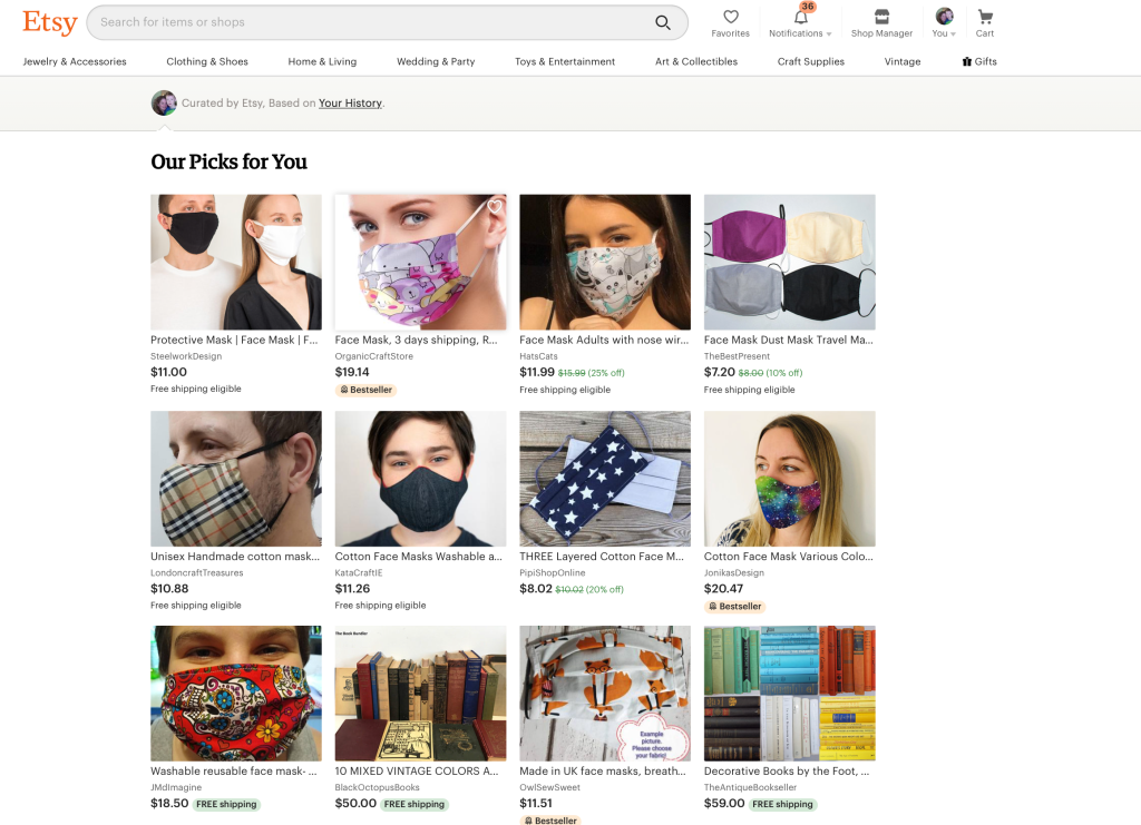 I don’t have a working sewing machine, so we fashioned our own facemarks. Mine was made from a cut up gym sock. Steve made his out of a manly blue bandana, safety pins, and my hair ties. I’ve since bought some on Etsy — the crafty website appears to be entirely devoted to adorable face masks now. The ones that I purchased (mint green kitten fabric) are out of stock, but there are plenty of alternatives.