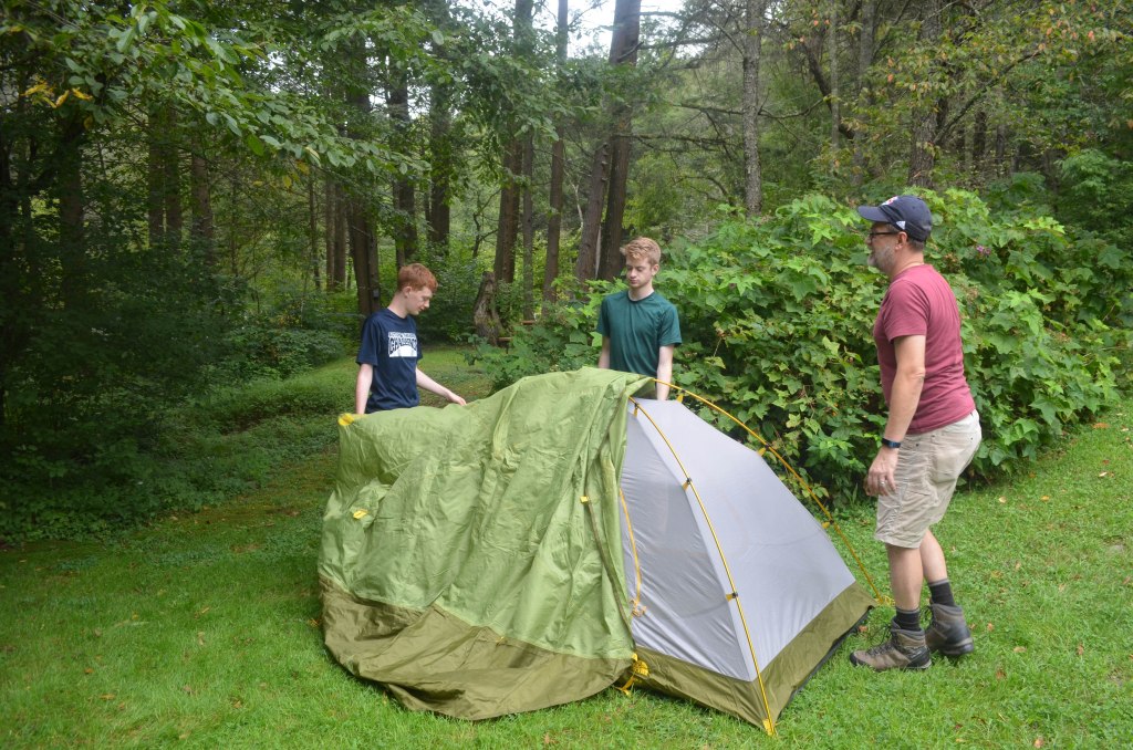 Get a good tent. If it rains, you do NOT want to sleeping in a puddle. Good brands are Kelty, Marmot, or Big Agnes. Make sure the system has a ground cloth and a tarp. With a family with teenagers, everybody should get their own tent. And always go a size up for comfort; a two person tent is really a one person tent.