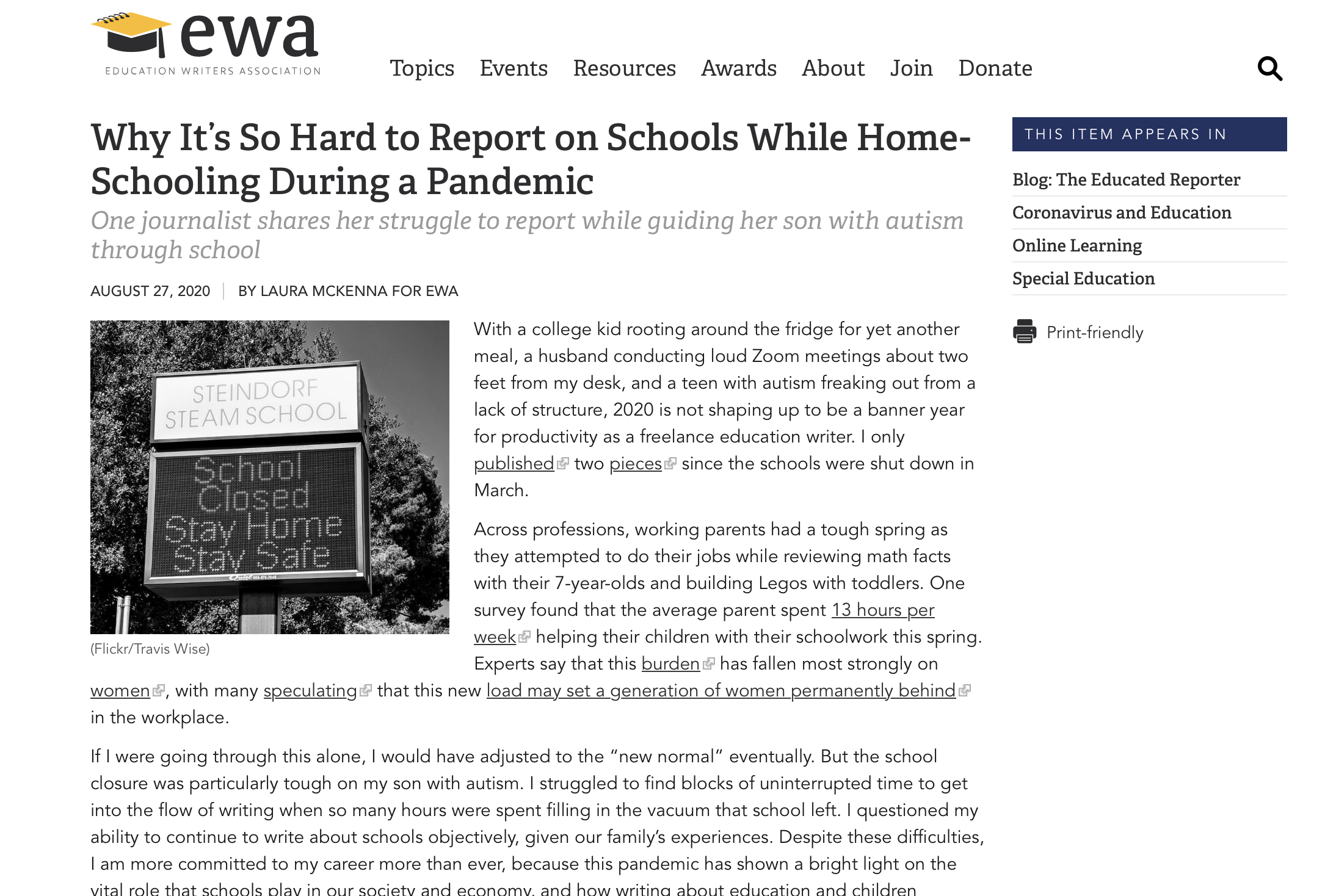 If I were going through this alone, I would have adjusted to the “new normal” eventually. But the school closure was particularly tough on my son with autism. I struggled to find blocks of uninterrupted time to get into the flow of writing when so many hours were spent filling in the vacuum that school left. I questioned my ability to continue to write about schools objectively, given our family’s experiences. Despite these difficulties, I am more committed to my career more than ever, because this pandemic has shown a bright light on the vital role that schools play in our society and economy, and how writing about education and children matters.