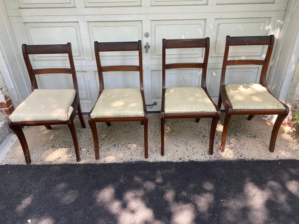 Our $14 IKEA chairs in the dining room are falling apart. Not a shocker. So, we’re rehabbing a solid set from the 1930s. Steve glued joints this weekend. Then we’ll give them a quick sand and paint them with Farrow and Ball paint. After I finish this post, I’ll get new seats made at Calico Corner. These are the before pictures.