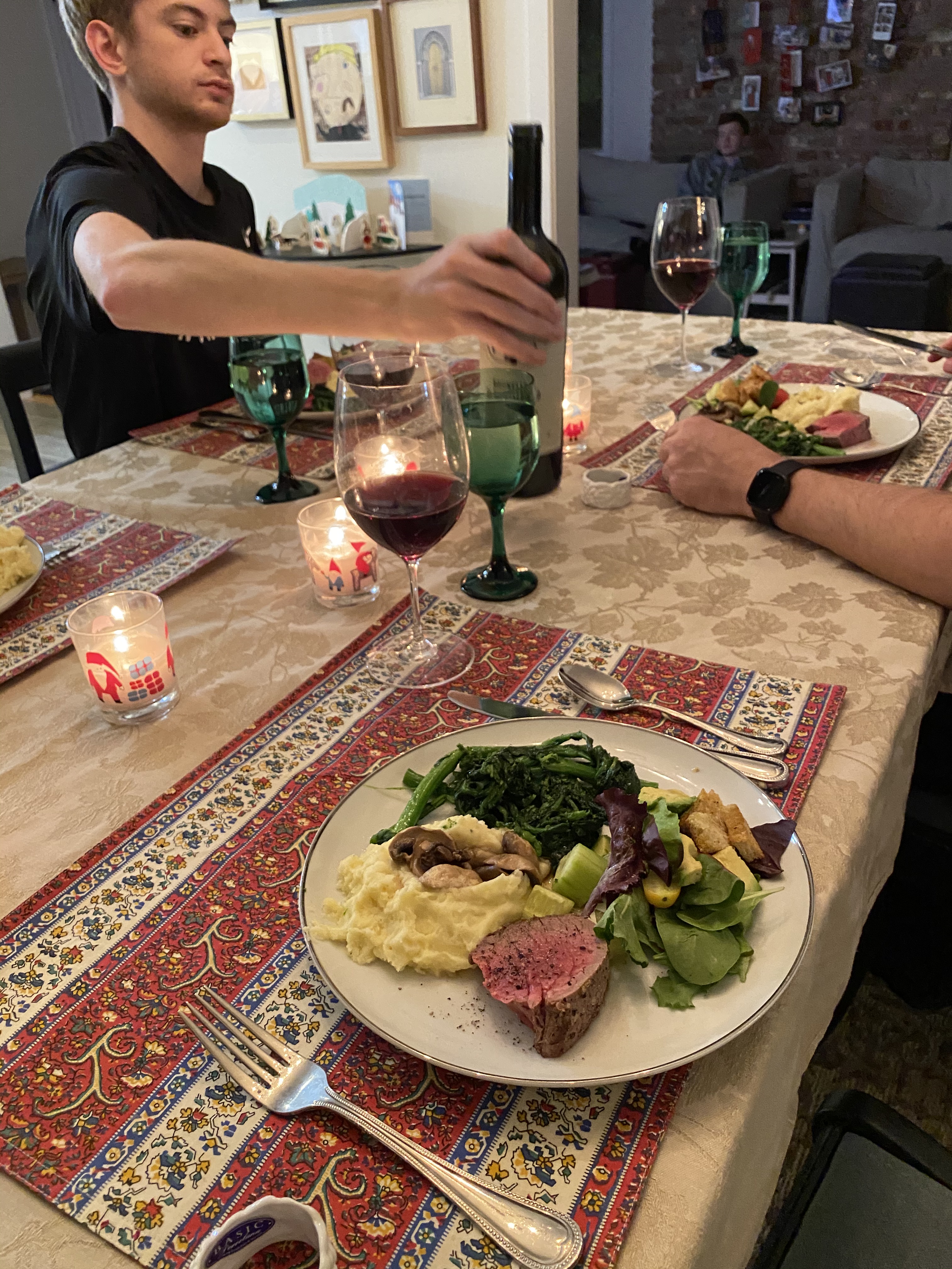 Close. Filet mignon, mashed potatoes with sautéed mushrooms/sherry, broccoli rabe/garlic slices, salad with homemade croutons. Sliced pineapple. Assorted cookies.