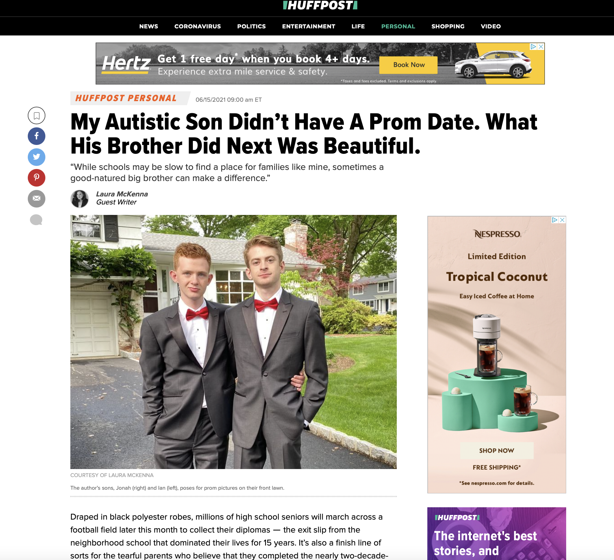 This week, I published an article about my boys and the prom. Sometimes, a picture of two handsome boys is really a Trojan horse for more serious issues, like inadequate special education, the lack of community support for families, and insufficient employment opportunities for adults with autism. First on the Trending list for Apple News that evening, the article went far and wide.
