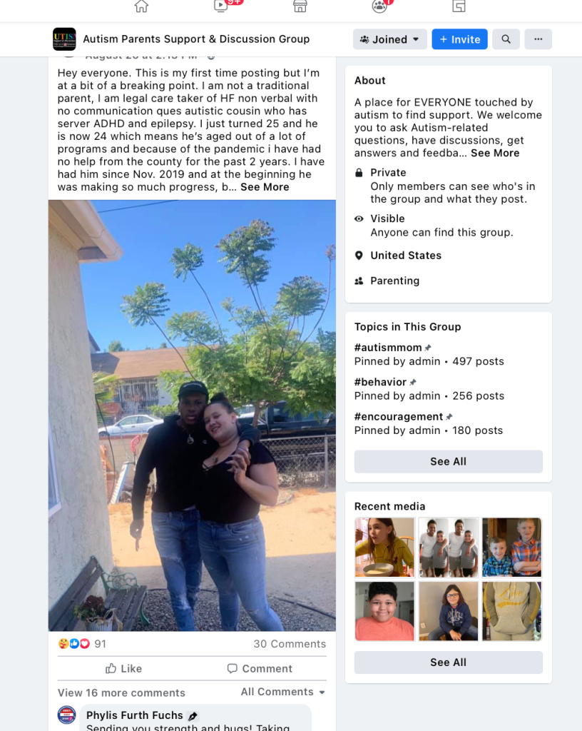 In August, a 25-year old woman, who is the caretaker of her 24-year old highly autistic cousin, reached out for help on Facebook. She posted an adorable picture of the two of them smiling broadly with their arms around each other, but she described a much tougher situation. Her cousin didn’t sleep more than four hours a night – a common issue with autism – so she couldn’t sleep, because he would escape the house or eat the stuffing in the sofa cushions.
