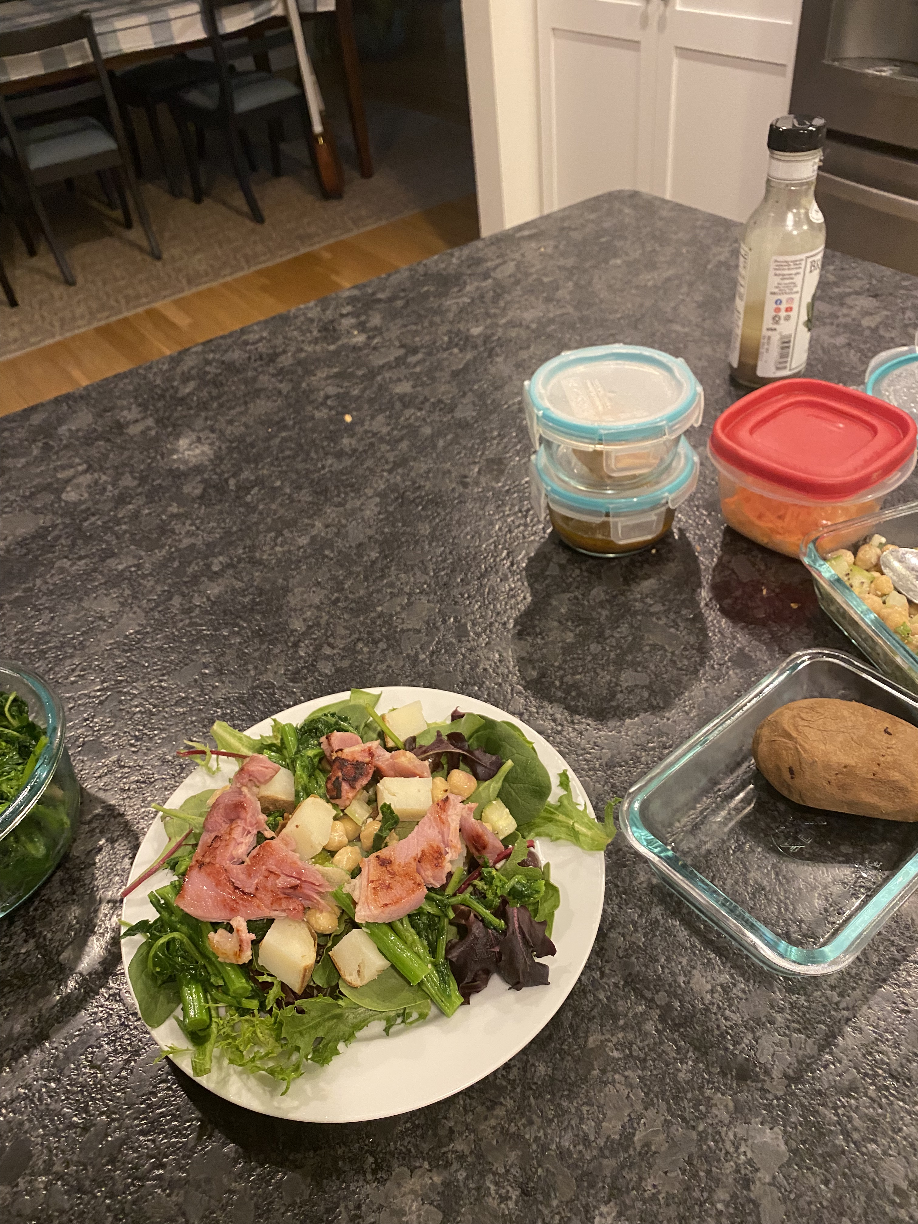 1. I cut up a leftover baked potato. Added some chick pea salad (chick peas, celery, cucumber, scallion, feta, Italian salad dressing). Chopped leftover broccoli rabe that had been sautéed with garlic and hot pepper. Lettuce. Everything was cold, except for the ham. The ham was frozen, leftover from Easter.