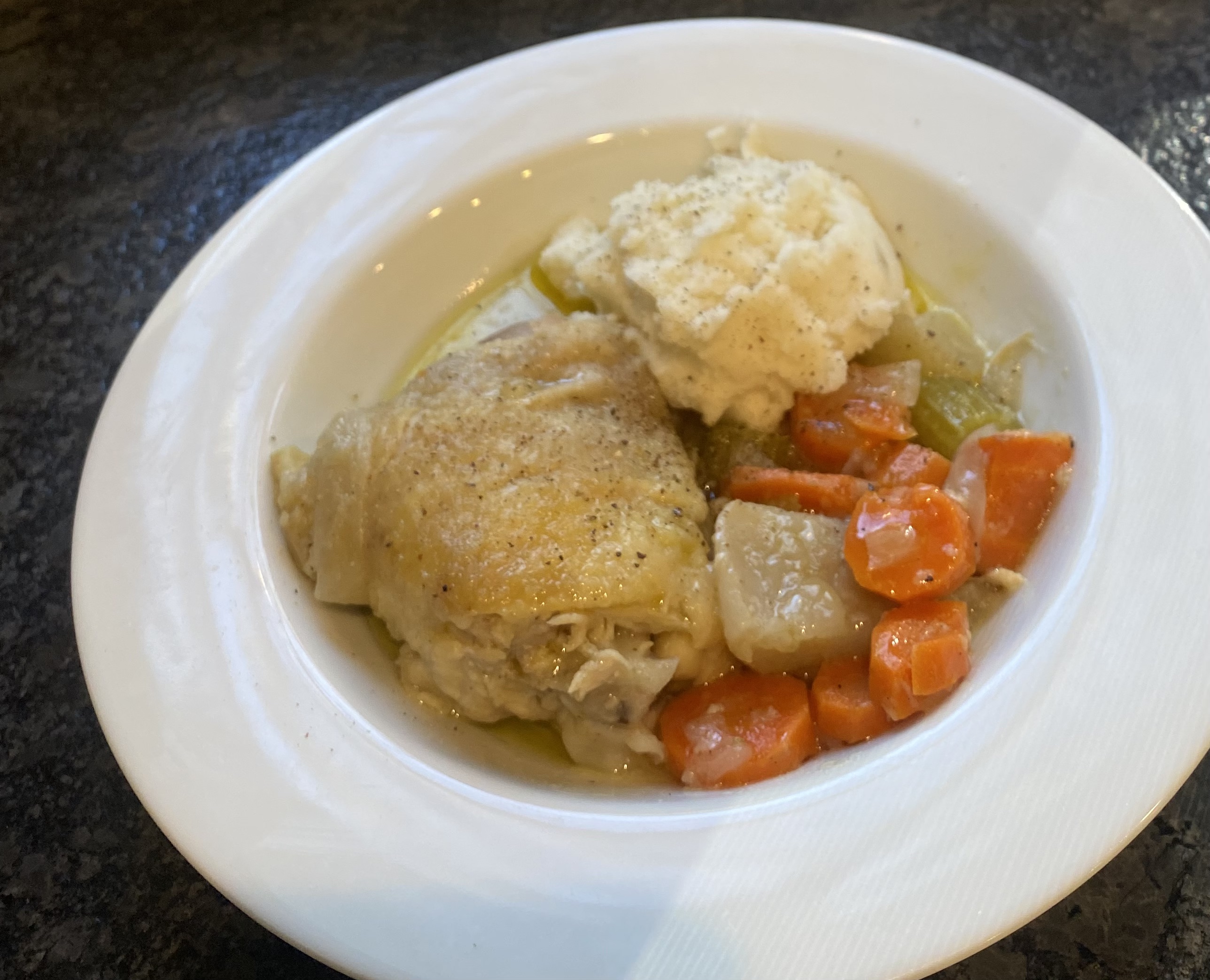 I actually have enough for another meal of chicken stew. Tonight, I’m changing up the flavor profile with a lot of tarragon. I’m taking the chicken off the bone and adding frozen peas and corn. Then I’m adding the top layer of mashed potatoes. Dot with butter. And bake at 350 for 30 minutes. With a side of garlic bread and salad. I have to do all this quickly, because I have to drive Ian to a tutor at 6:15. Steve and Jonah will help themselves when they get back from work.
