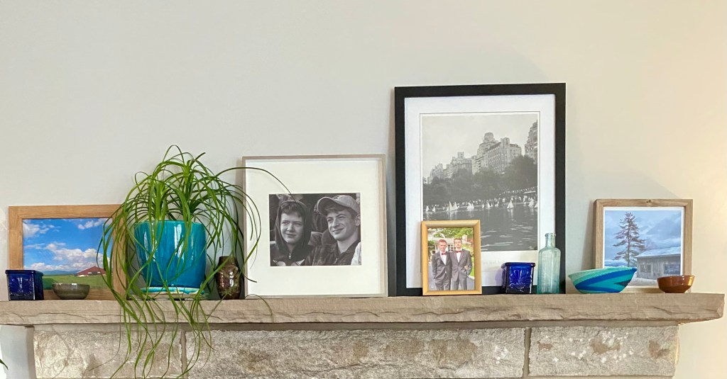 My OCD is off the hook with all the workers and dust in the house, so I’m cumpulsively reorganizing objects on the fireplace mantel. This display will probably last another 24 hours.