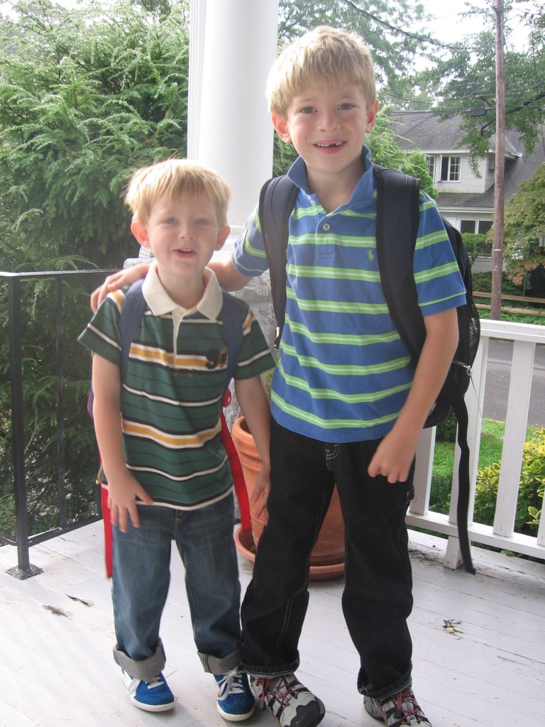 PICTURE: Ian, age 4, and Jonah, age 6, on their first day of school. One of those years that I tried to juggle work with the academic career.