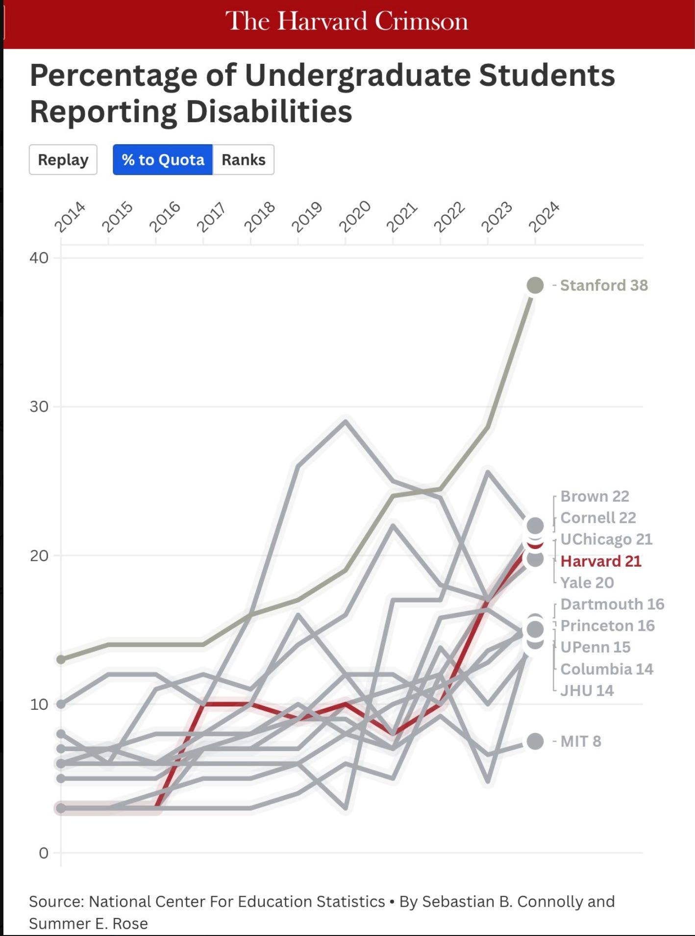 So, here’s a fun little chart that shows the disability rate across the elite colleges. Stanford’s disability rate is 38 percent. MIT is on the low side at 8 percent, which is odd because 1/3 of the students probably are legitimately on the autistic spectrum. Maybe another day, we can talk about what makes MIT different.