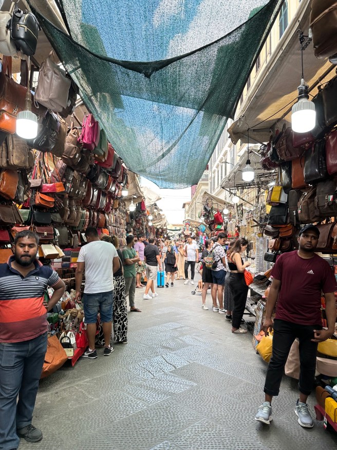 Florence is one of the prettiest cities that I’ve ever seen. New York City is a city of immigrants intent on making money. Sure, a building might have a nice arch or a little marble in the lobby, but for the most part, the city was built by people, who put aesthetics way down on their list of priorities. Florence was built by people, who had tons of money and were OCD about things like symmetry and design. People’s worth was based on the artists that they supported. And then subsequent generations maintained it all. Even the fancy, designer stores are housed in ancient buildings. Prada bags in 15th century buildings. I’ll share those pictures another day. Here are just pictures of bridges, the Duomo, and the leather market.
